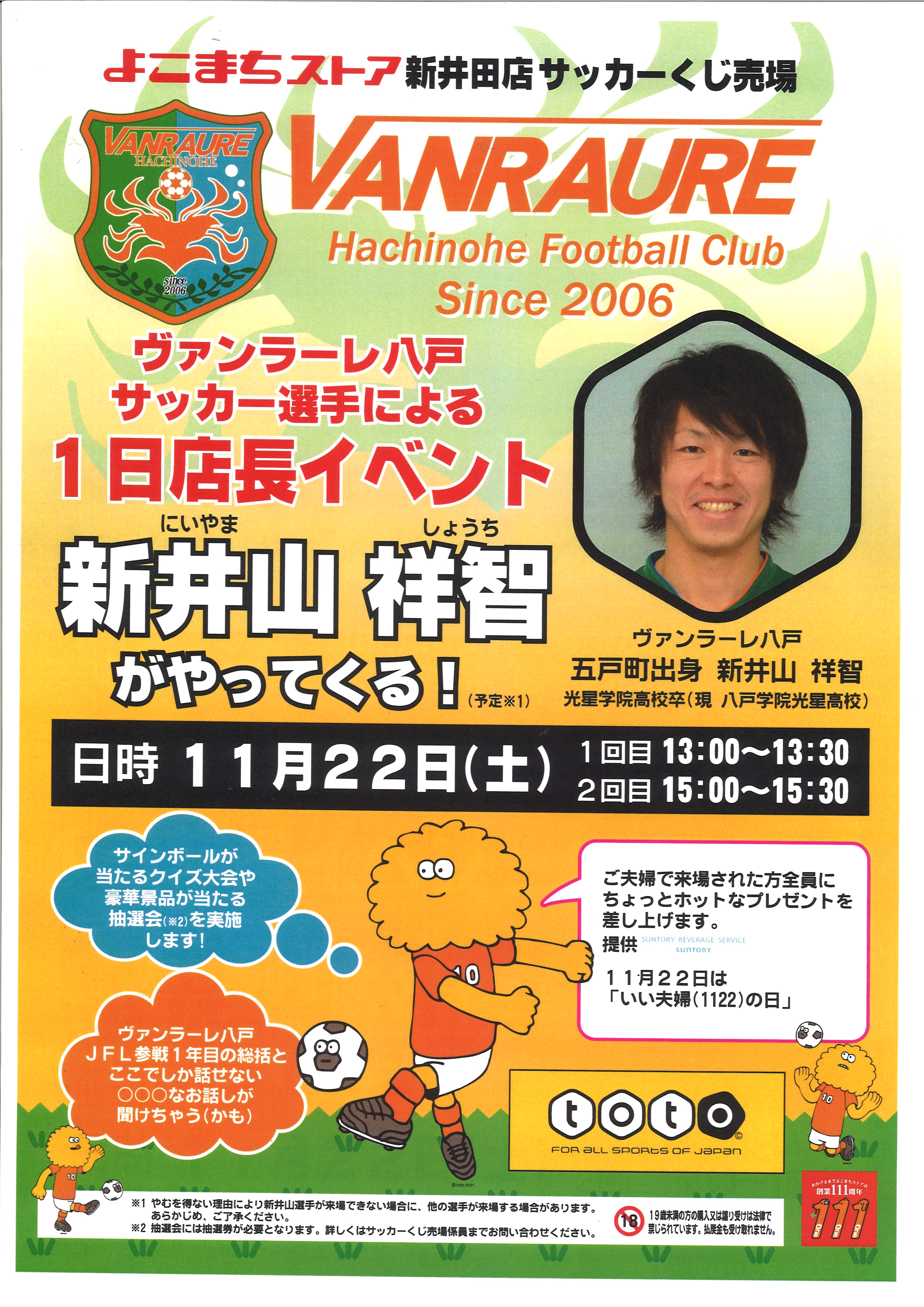 「新井山祥智 サッカーくじ売り場1日店長」イベントを行う事となりました。
