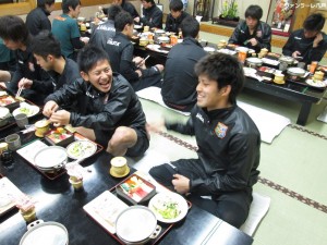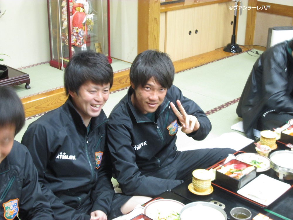 ご飯を食べながら笑顔の松野選手と佐々木選手