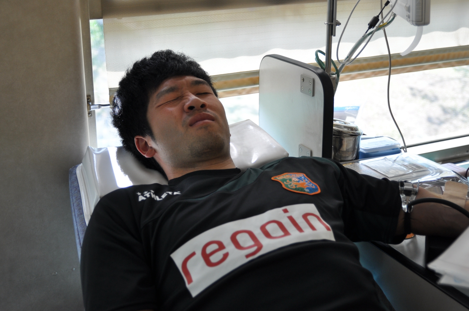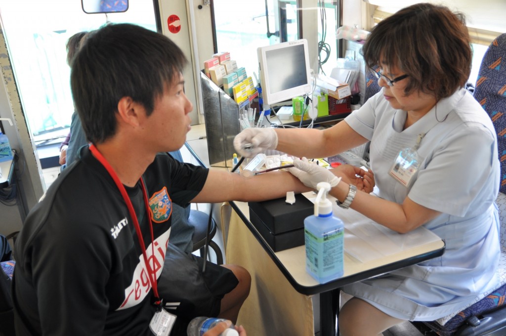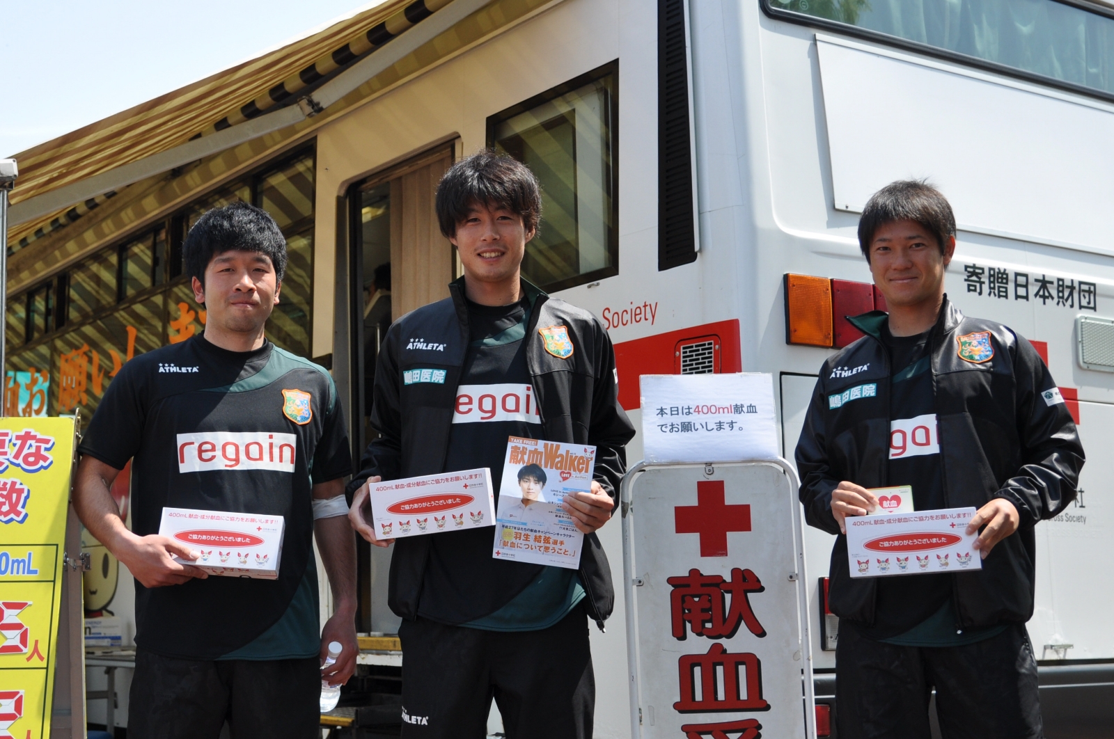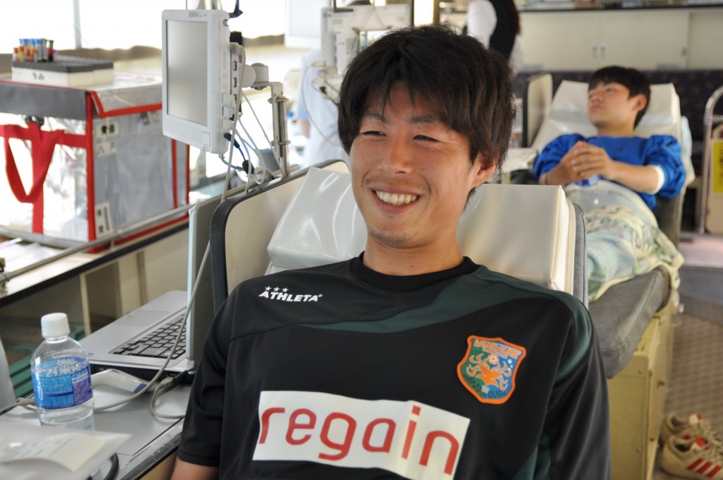 青森県赤十字血液センターの献血車が登場!涼しい顔で献血に協力する定人選手と中筋選手。そして苦悶の表情のクマモン選手(^O^)