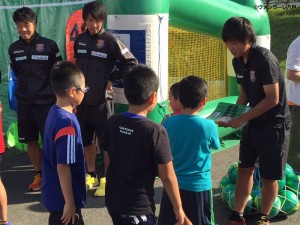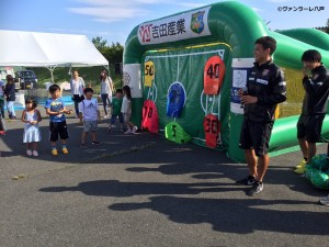 キックターゲットを見守る阿部選手と西村選手 参加してくれた子どもにヴァンラーレグッズプレゼントをしました。