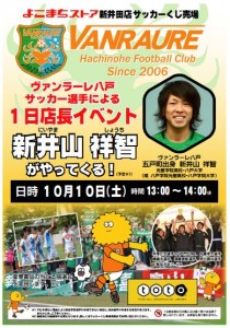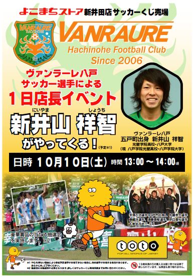 【日時】 10月10日(土) 13:00~14:30 ( サッカーくじ「toto」紹介、ヴァンラーレ八戸選手トークショー、抽選会、サイン会・握手会・写真撮影会)