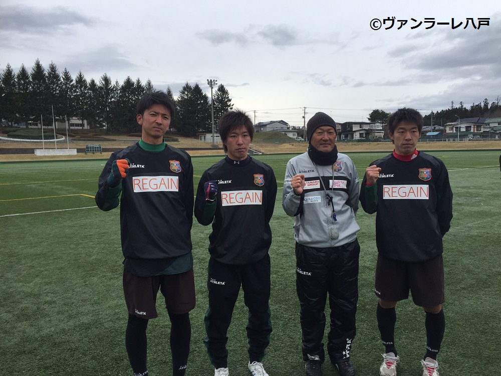 本日、五戸ひばり野運動公園サッカー場にて、JFL選抜海外遠征に召集されました望月監督、菅井拓也選手、菅井慎也選手、須藤貴郁選手の取材を行いました。
