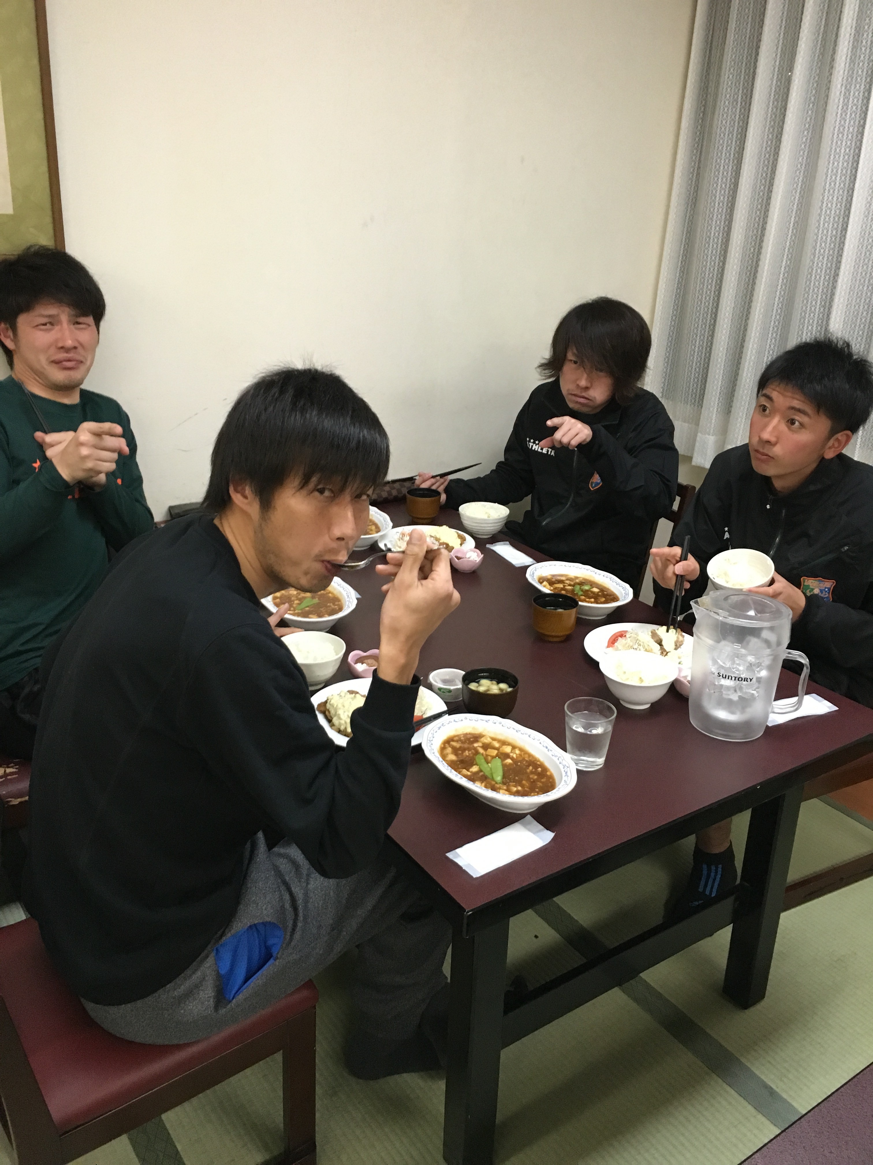 夕食を食べる市川選手、岡田選手、須藤選手、新井山選手
