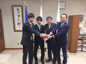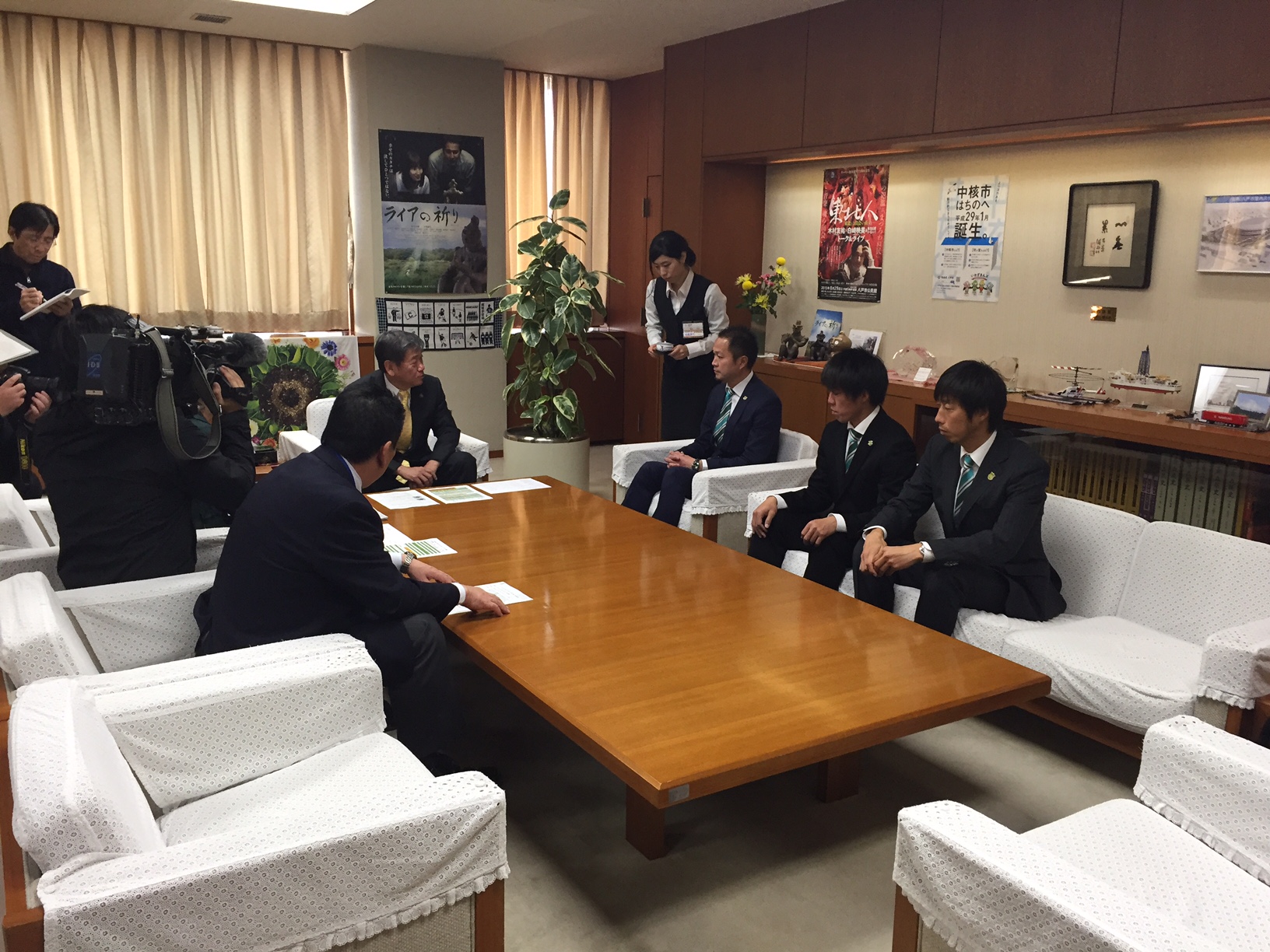 本日、ヴァンラーレ八戸 代表 細越 健太郎・菅井 拓也主将・市川 大祐選手の3名で、2016シーズンの結果報告と市川選手の現役引退の報告を兼ねて、小林 眞市長を表敬訪問して参りました。