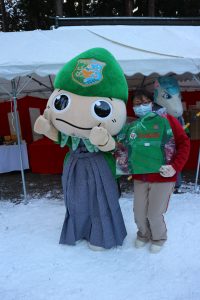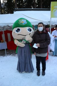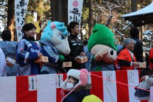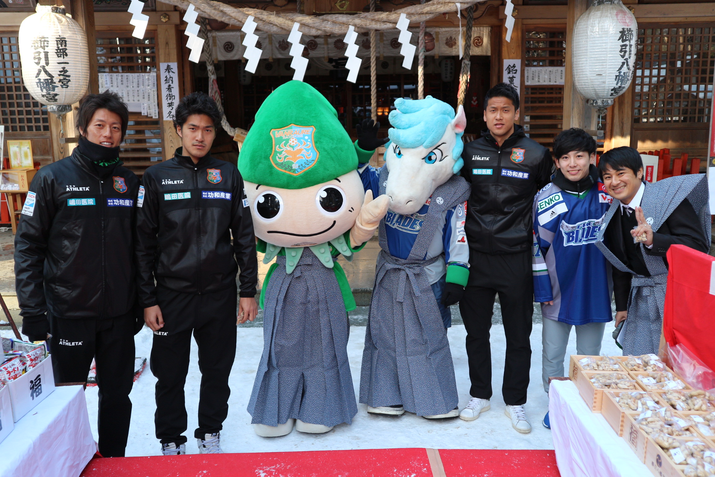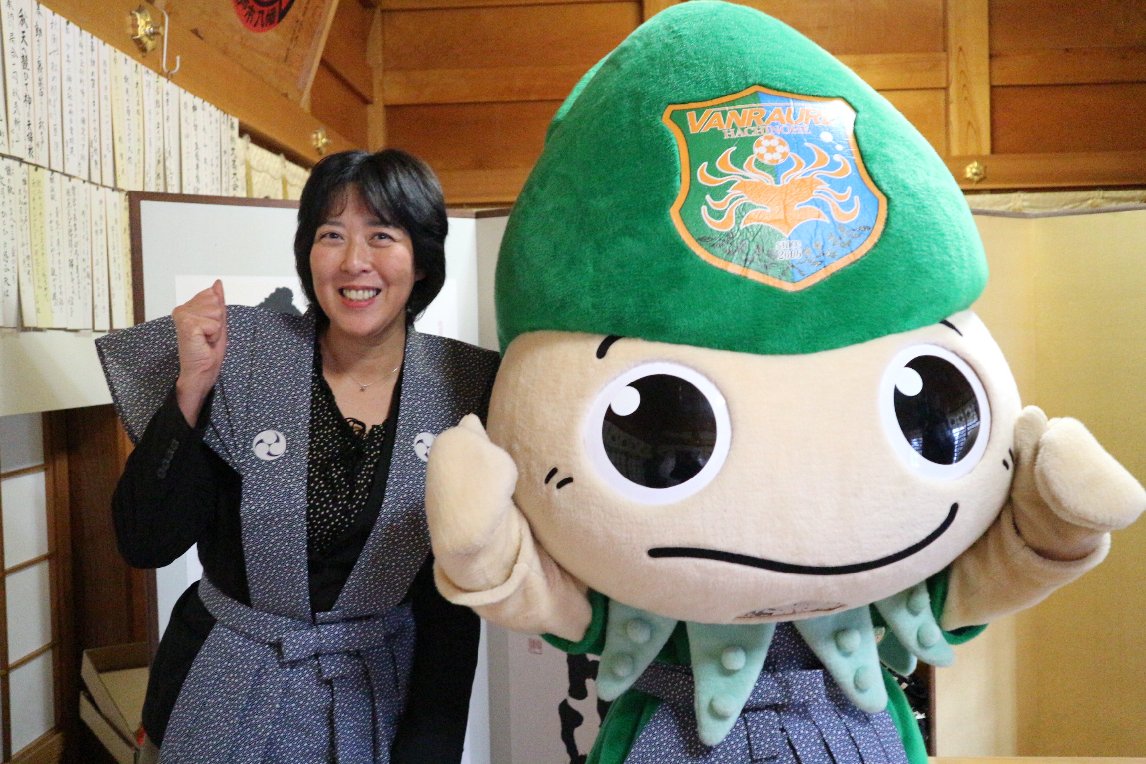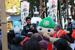フリーブレイズのブレイジーくん、MCの小泉さんと裃姿で登場。