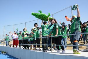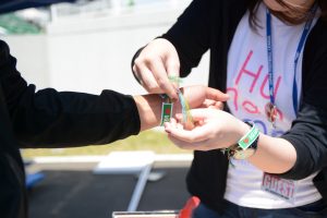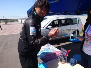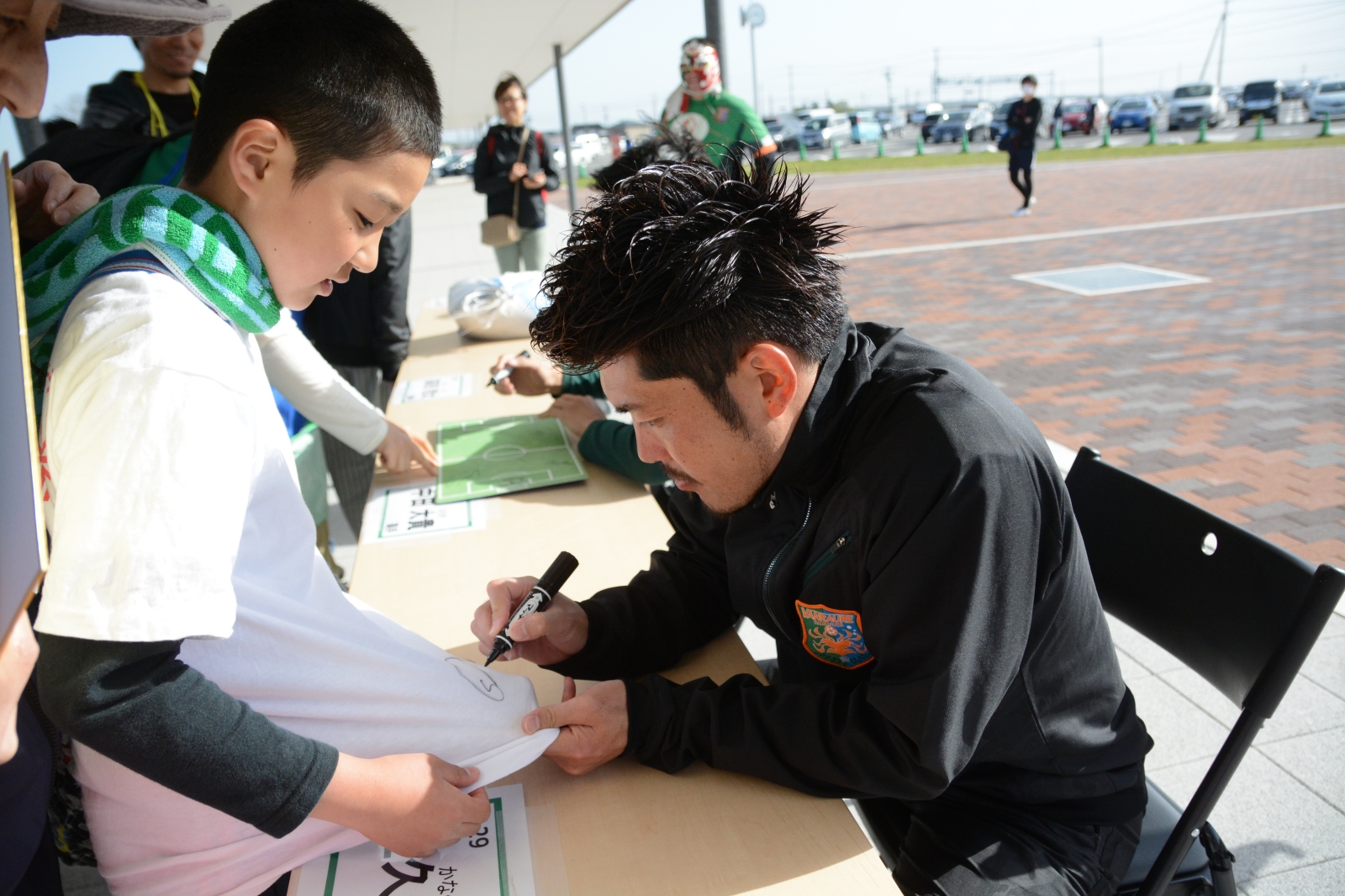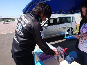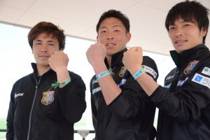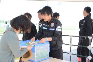 ゲートでは選手がお出迎え。共同募金さまとのコラボミサンガを腕に巻いてPRにも貢献しました。
