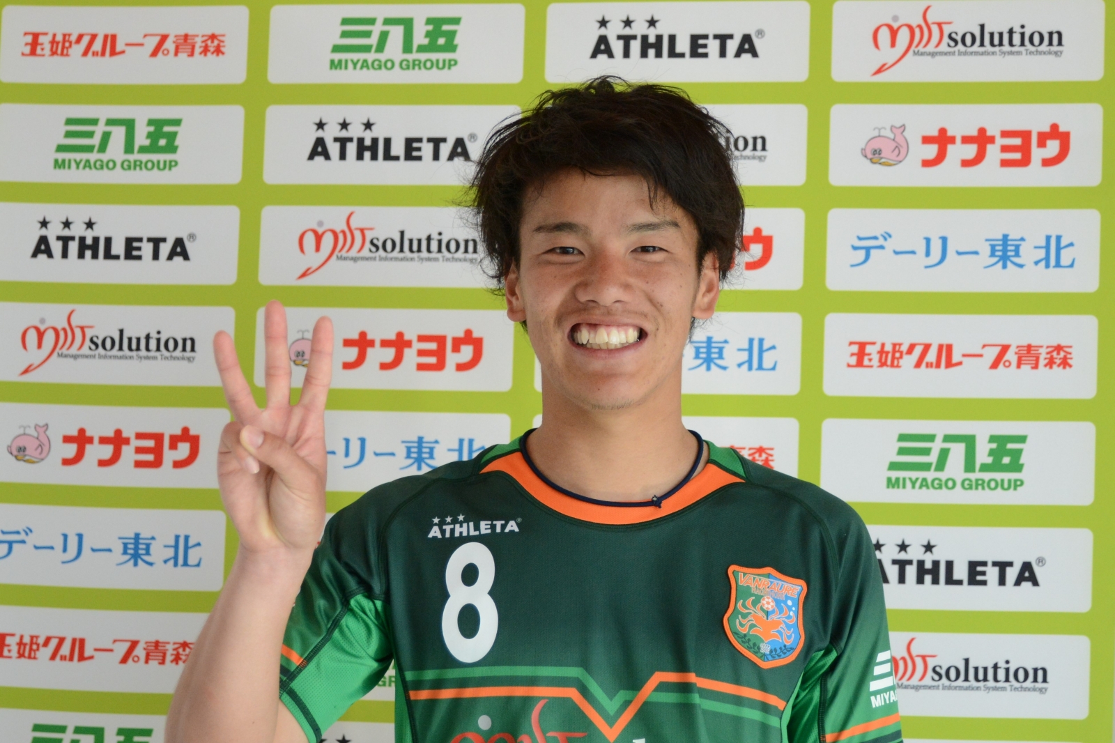 ヒーローインタビューは3得点を決めた#8高見啓太選手です。