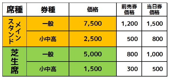 ただし、メインスタンドで座席が必要な場合、小中高チケットをご購入ください。