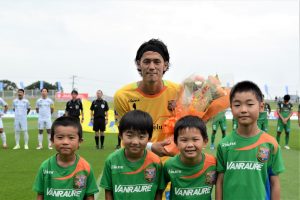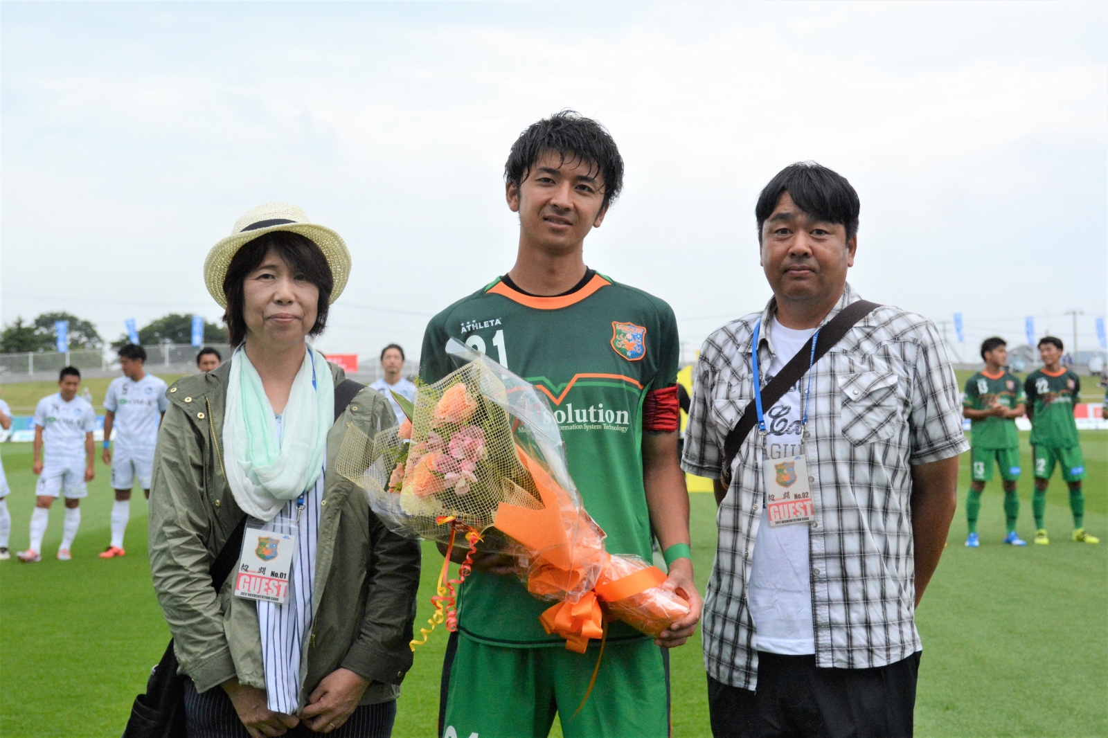 試合前には#21須藤選手、#1山田選手のJFL通算100試合出場を記念しまして、