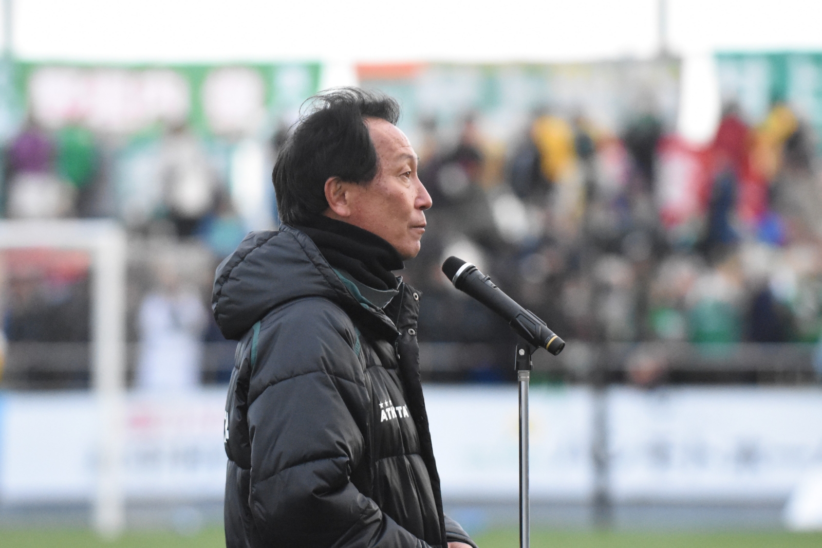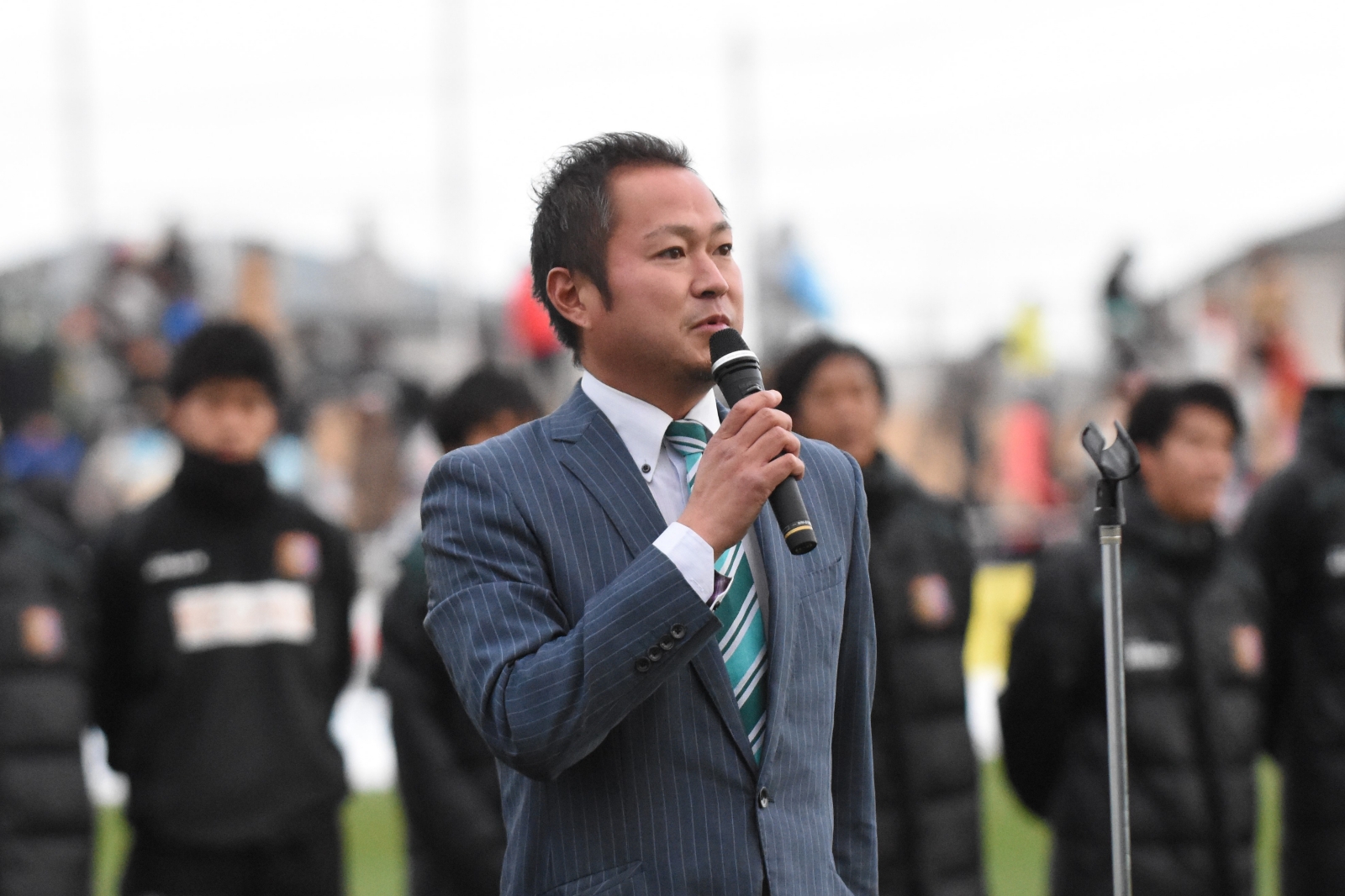 代表取締役 細越健太郎、柱谷監督、須藤主将がみなさまに挨拶をしました。