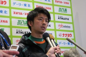 #21須藤選手、#22穂積選手、#10新井山選手、#3成田選手、#29金久保選手、#39竹中選手が取材を受けました。