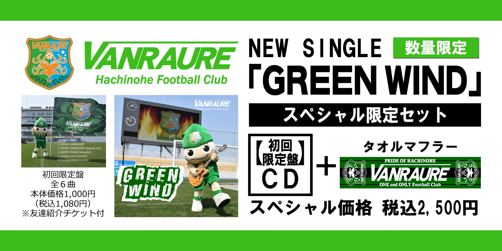 「GREEN WIND~緑の風に夢のせて~』 初回限定版特典 ◇ホーム戦友達紹介チケット付き(芝生席)1枚 CDリリース特別企画 期間 2018/6/10~2018/11/11まで ◇友達を誘って、ヴァンラーレリングをゲットしよう!! (友達紹介チケットを使ってダイスタ参戦でヴァンラーレリングプレゼント) ¥1,000-(税抜)
