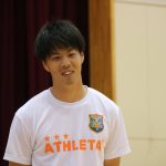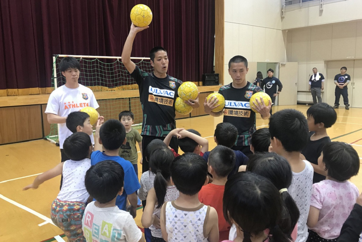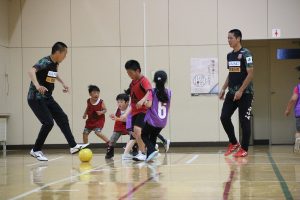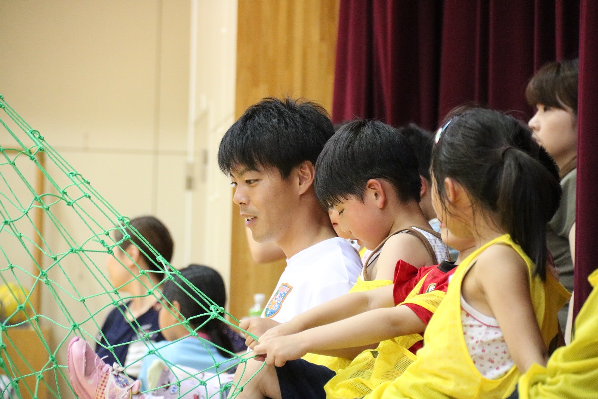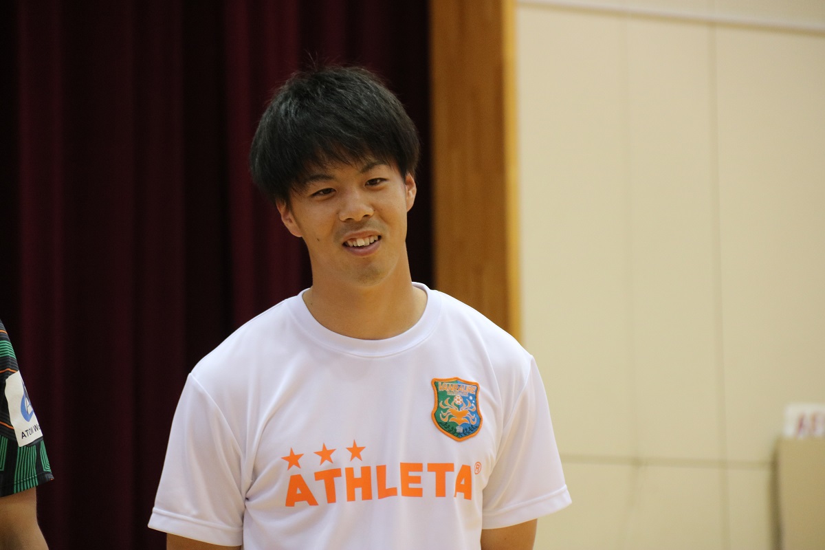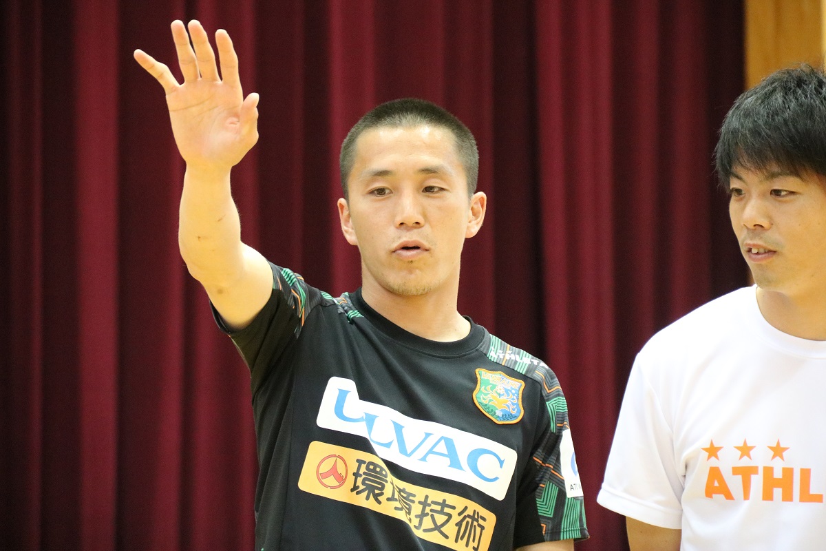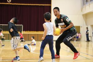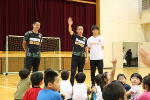 約40名の小学校低学年を中心に、ヴァンラーレ八戸の事やサッカーの楽しさを伝えました。