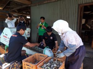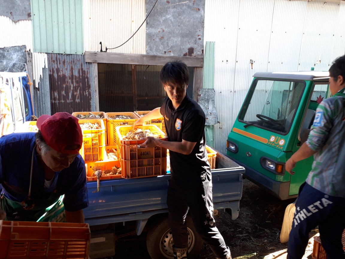 収穫・選定作業(畑で大小振り分けてコンテナに入れます)