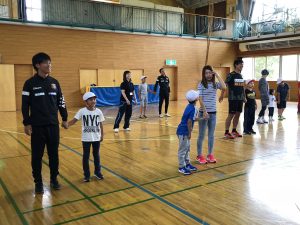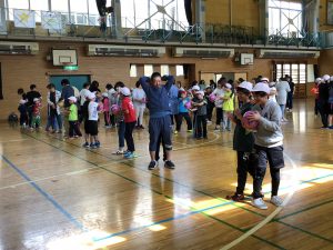 お話の後は選手のお手本を見ながら、みんなでウォーミングアップ!