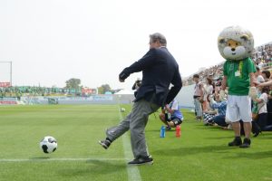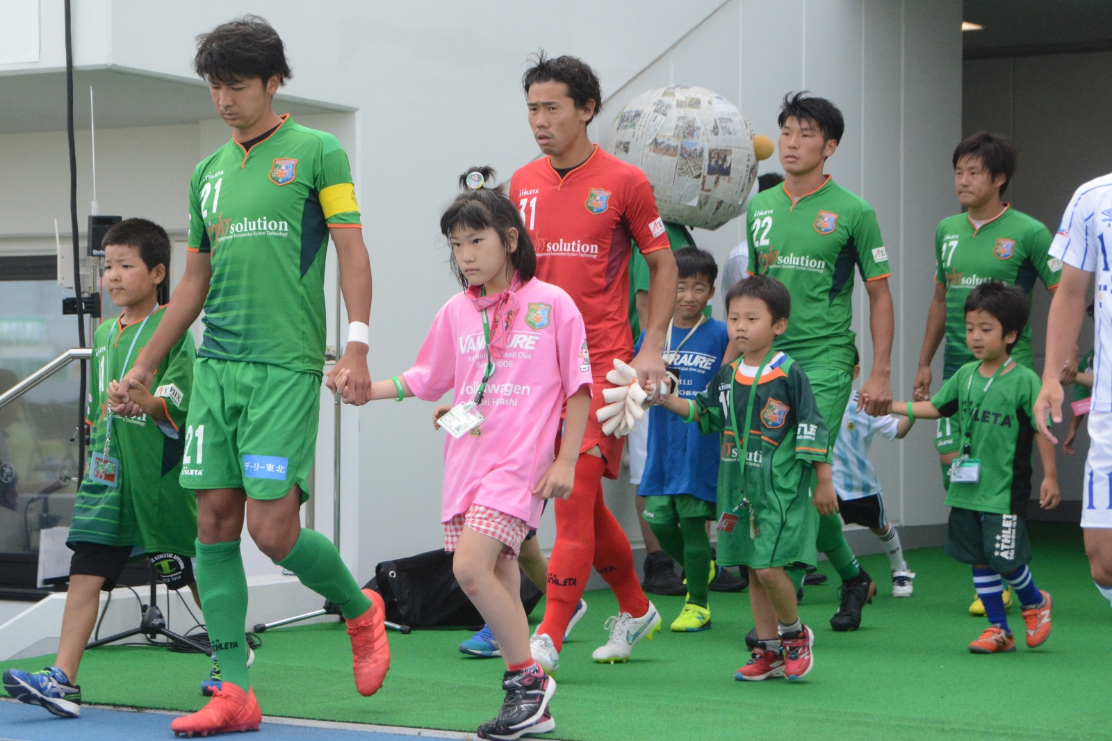 マスコットキャラクター『デリオン』と共に入場。ナイスキック!!