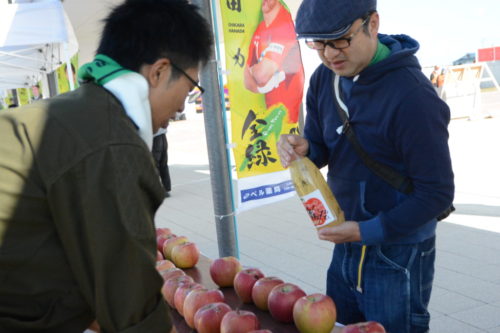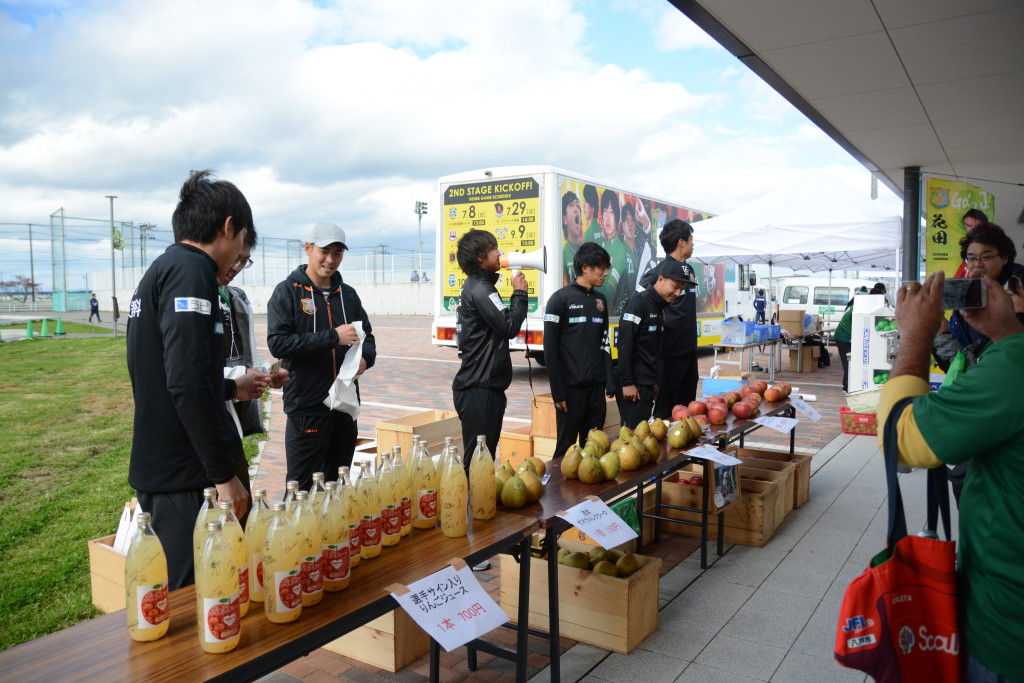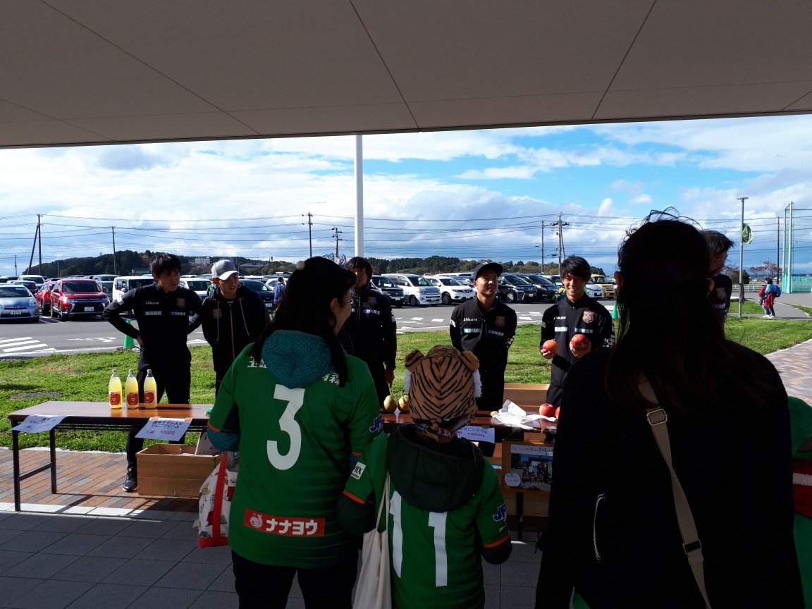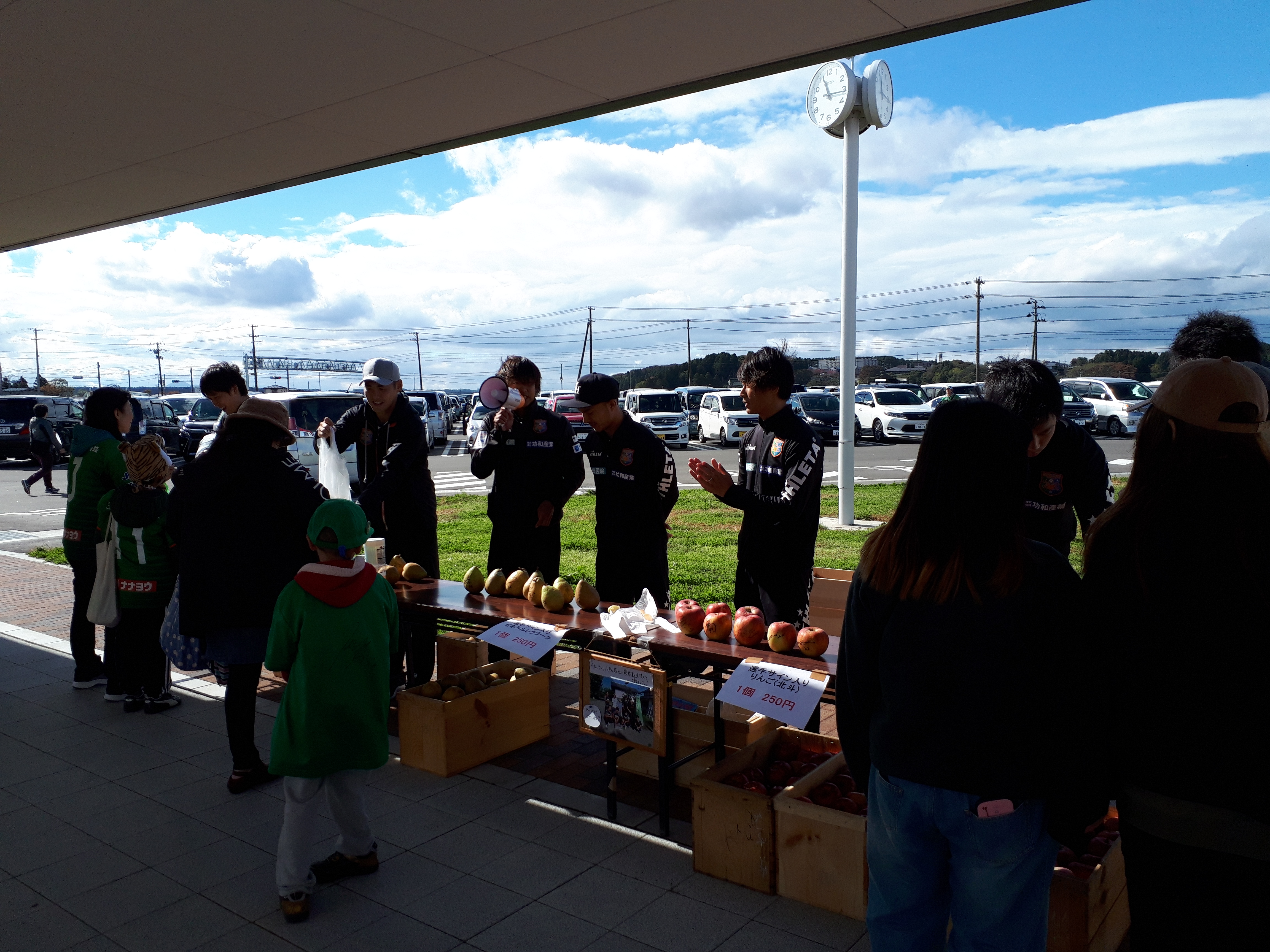 10月28日(日)、ホームゲームで以前、農作業支援させていただいた南部町の河守田農園のりんご、ゼネラルレクラーク、りんごジュースを販売の手伝いをさせていただきました。