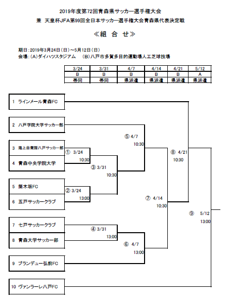サッカー日本一を決める天皇杯 JFA 第99回全日本サッカー選手権大会の予選となります 、2019年度第72回青森県サッカー選手権大会の組み合わせが決まりました。