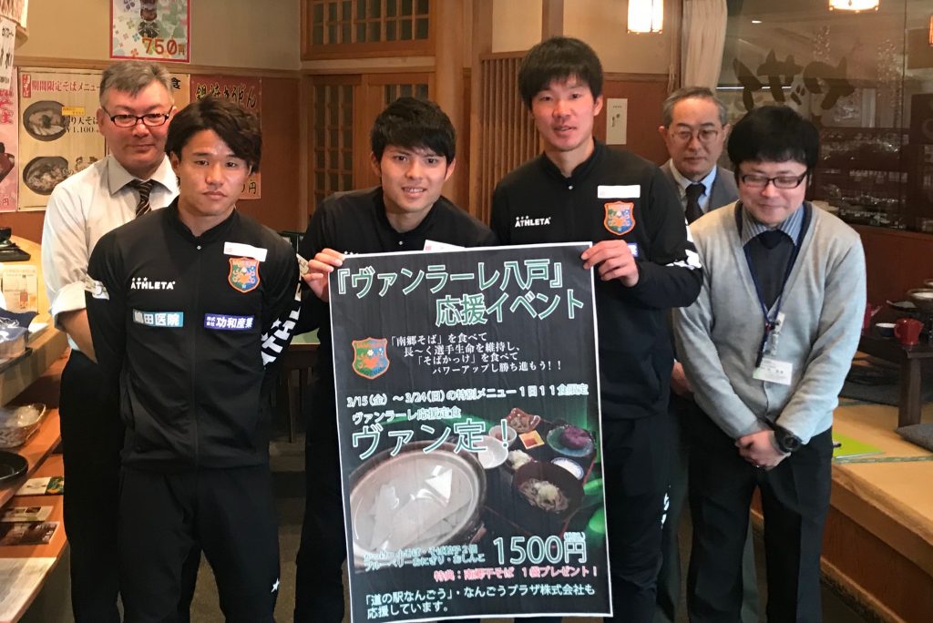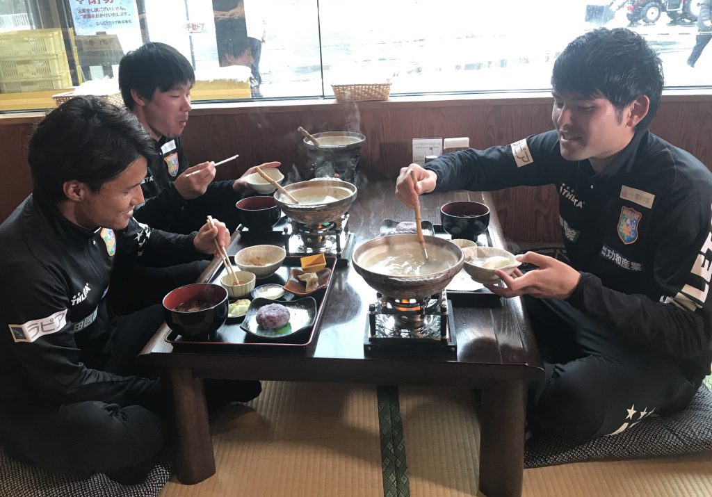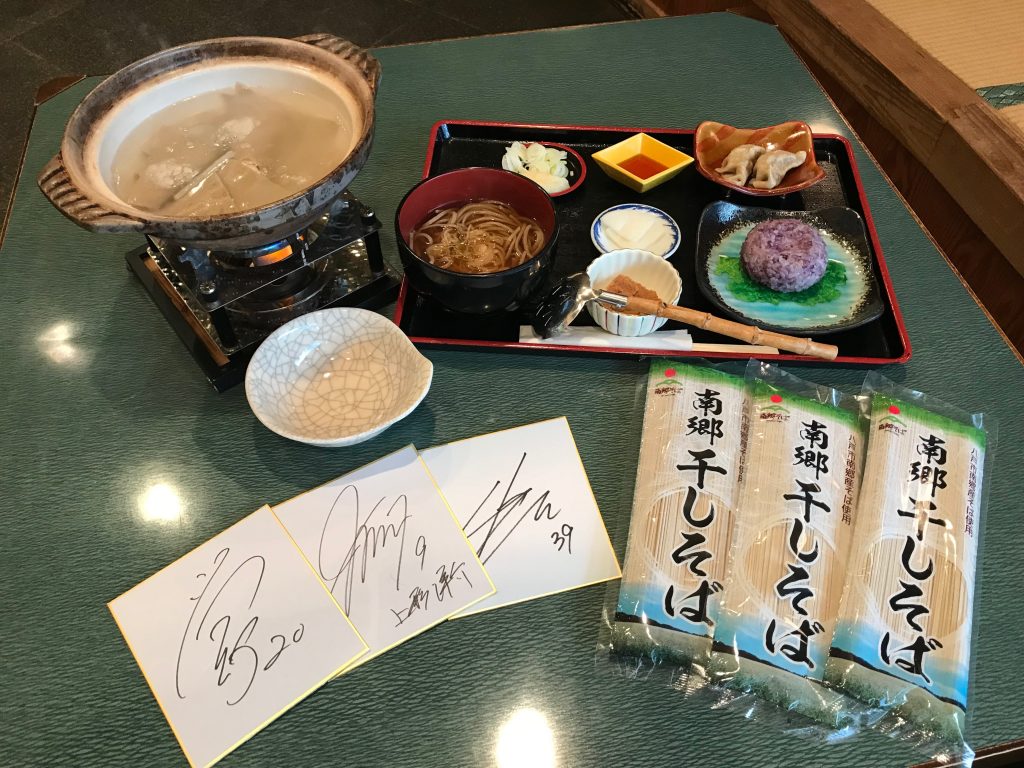 本日、グリーンプラザ南郷内のそば処三稜荘において「蕎麦を食べて長~くプレーして、かっけを食べて勝とう!!」イベントが行われ、上形選手、三田選手、近石選手が参加しました。