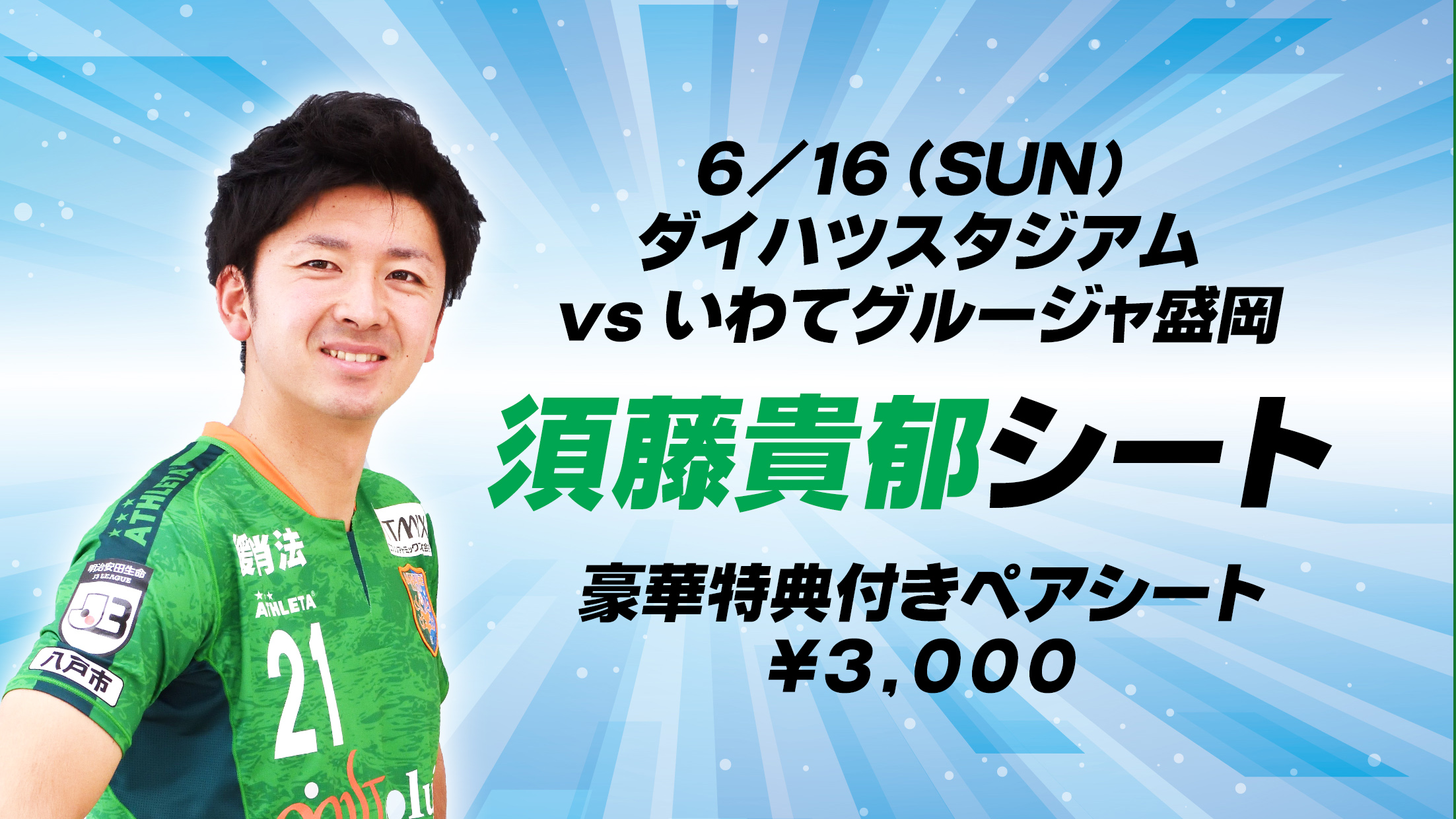 【特別VIP席】選手応援シートの販売が決定しました! 今節は須藤 貴郁選手応援シートとなります。 このチケットは『ペアシート』となります。 もちろんお一人様でゆったり観戦されてもOKです。 ペアシートで三千円はとってもお得!! 特典もたくさんついていますので、 どうぞお買い求めください!