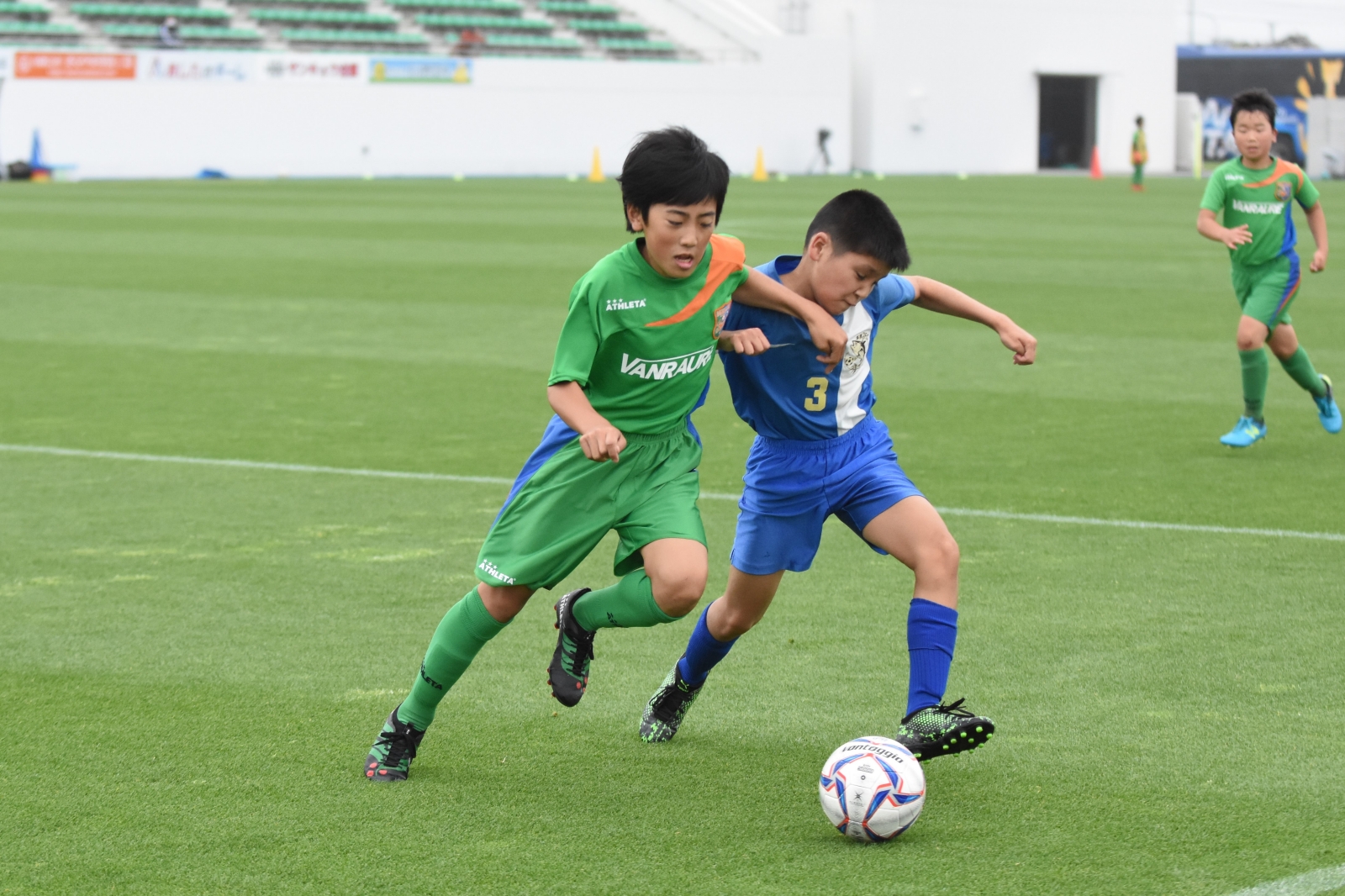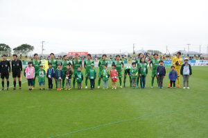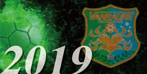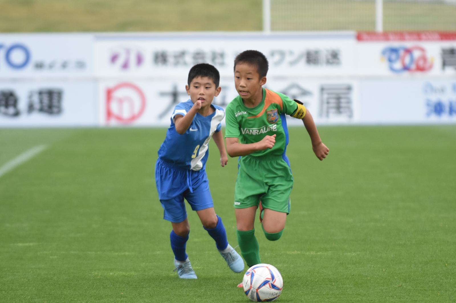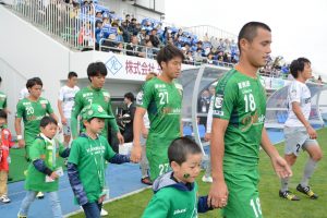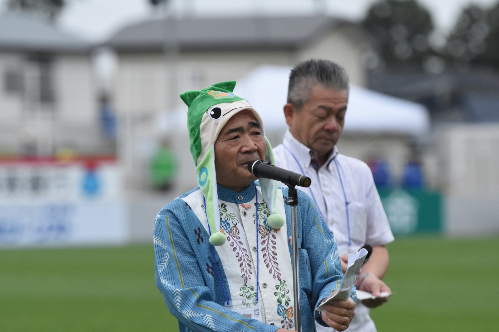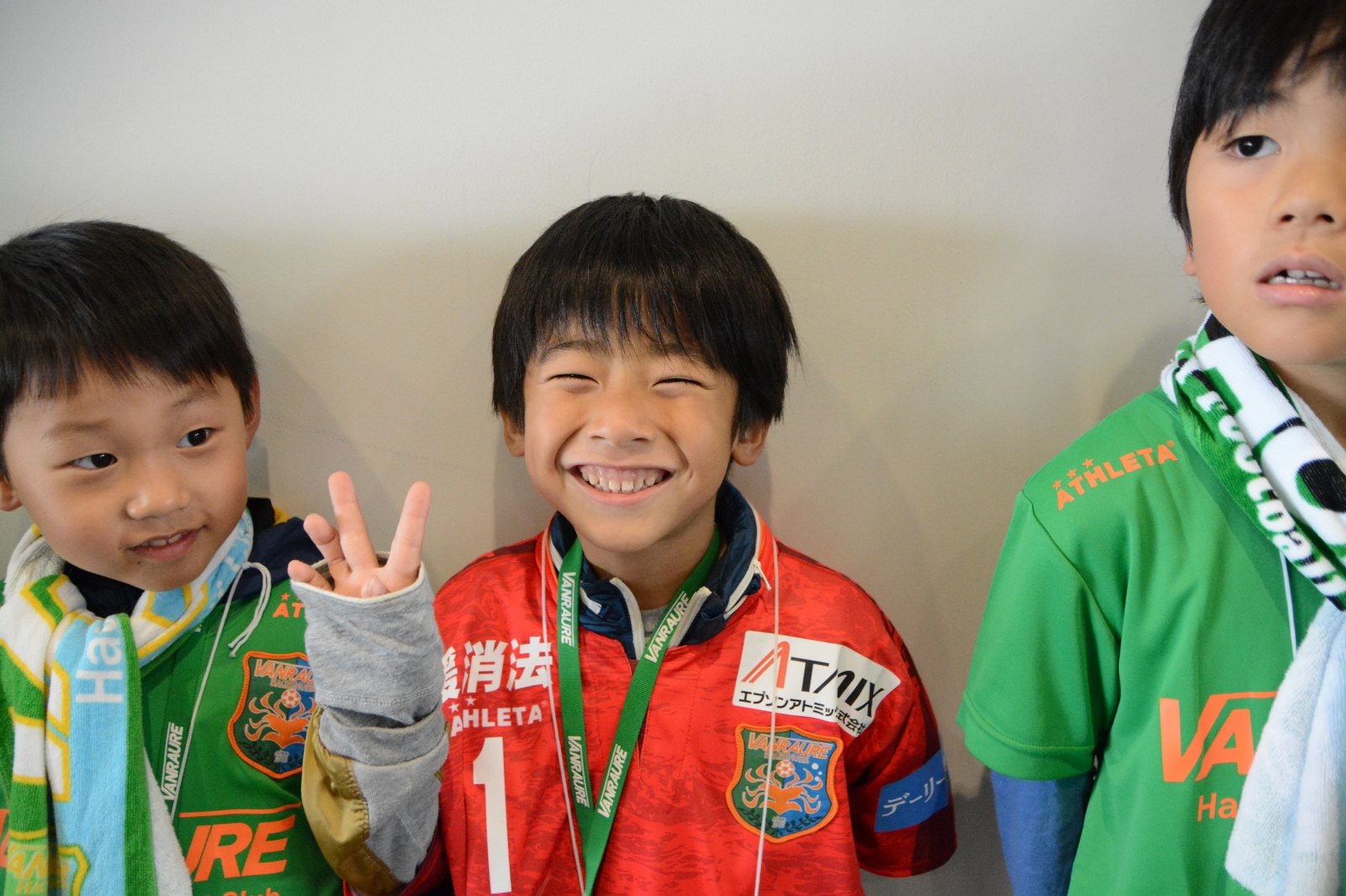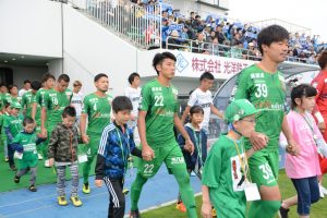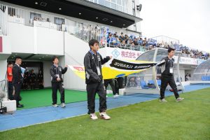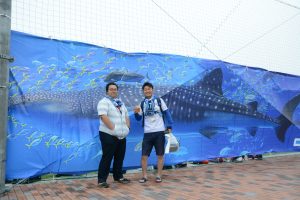 沖縄デーとして、物産展やミス桜の来場、本部町観光協会会長 當山清博さまからのご挨拶、ジンベイザメタペストリー展示、そして試合前にはヴァンラーレU-12対本部JFCの熱戦が繰り広げられました。