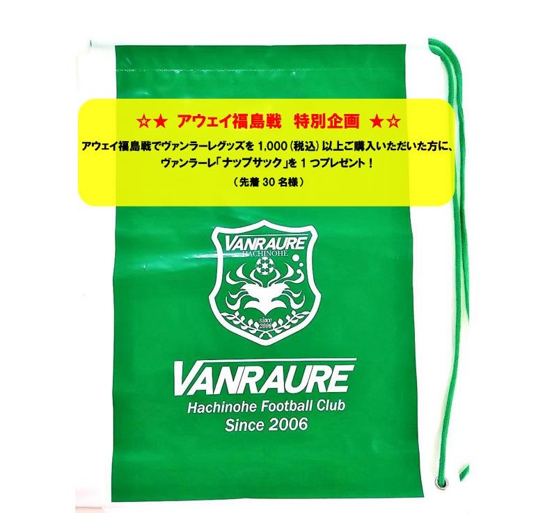 また、この日ヴァンラーレグッズを¥1,000(税込)以上ご購入いただいた方には、ヴァンラーレの『ナップサック』をプレゼント(先着30名様)いたします!!