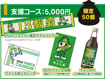 1個限定(2019ヴァン太くんユニフォーム✕1・ 2019ヴァン太くんのぼり✕1・ 日本酒「陸奥八仙」ヴァン太ラベル✕1・2020クラファン限定タオルマフラー✕1・ ヴァンたれ(ヴァンラーレ八戸×上北農産加工コラボ商品)✕1・2020ヴァン太名刺(開店イベント参加権付き)✕1)