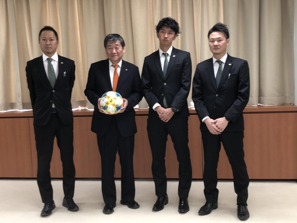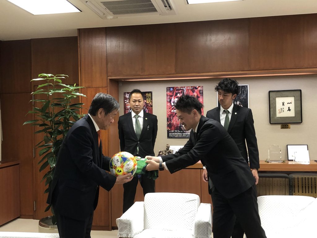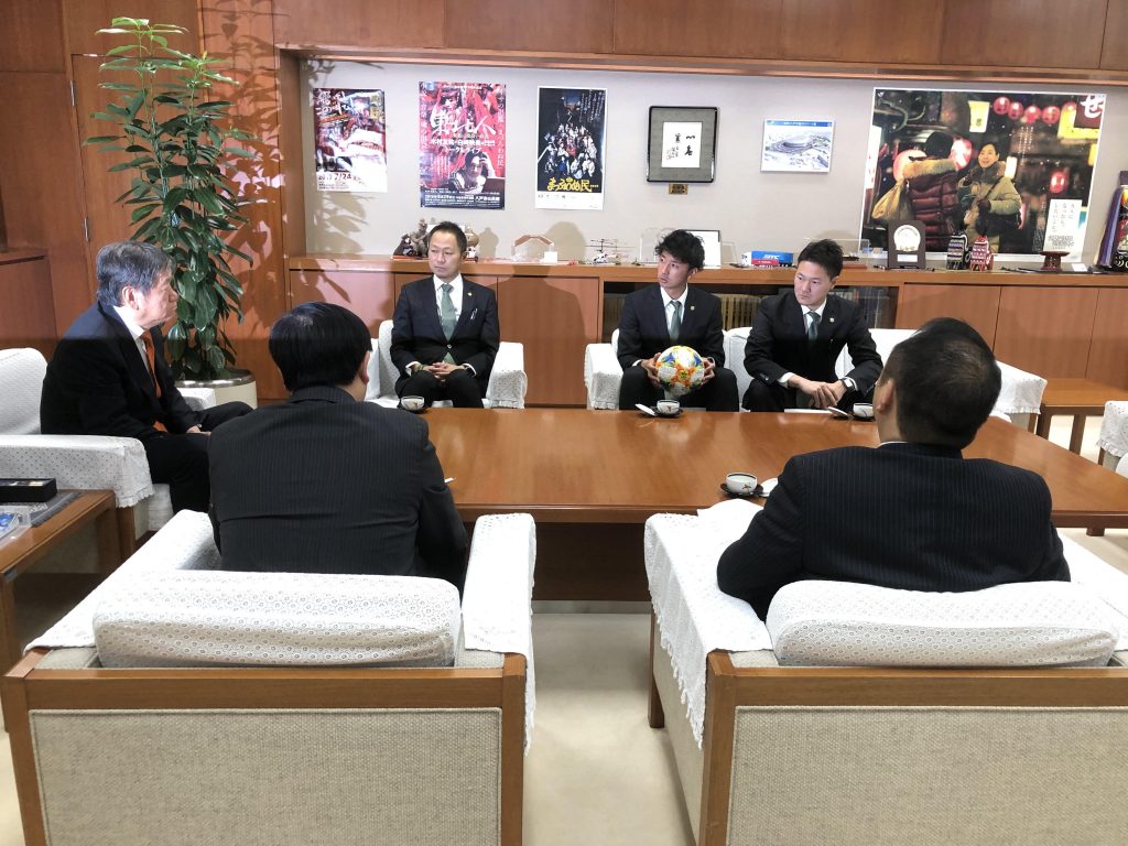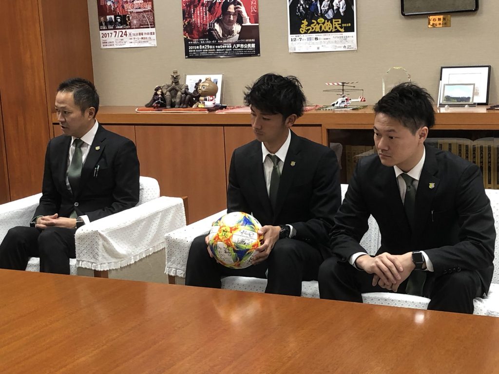 本日、代表取締役 細越健太郎、取締役事業統括本部長 菅原康平、キャプテン須藤貴郁の三名が2019シーズン終了の報告のため八戸市の小林眞市長へ表敬訪問して参りました。