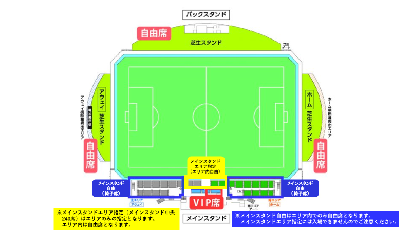 ※VIP席は残席がある場合のみ、当日券売場にて販売いたします。 □未就学児は無料。 ただし、メインスタンドエリア指定・自由で座席が必要な場合、小中高チケットをご購入ください。 □メインスタンドエリア指定・自由は席に限りがございますので、試合毎のチケットとなります。 □芝生席は試合毎チケットとなります。 □障がい者割引チケットご購入の皆様:当日券売場にて身体障害者手帳・療育手帳・精神障害者保健福祉手帳のいずれかをご提示ください。 手帳のご提示がない場合、割引販売できませんので予めご了承ください。 □車イス席はなくなり障がい者チケットと同額となります。 □お客様のご都合、不可抗力などの事由で試合が中止となった場合の払い戻しはいたしません。順延・変更となった試合のご観戦になります。 □チケット裏面の注意事項をよく読みマナーを守った観戦をお願いします。