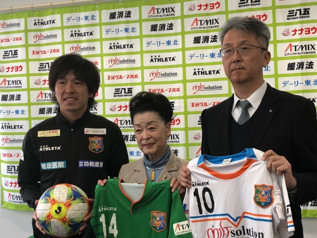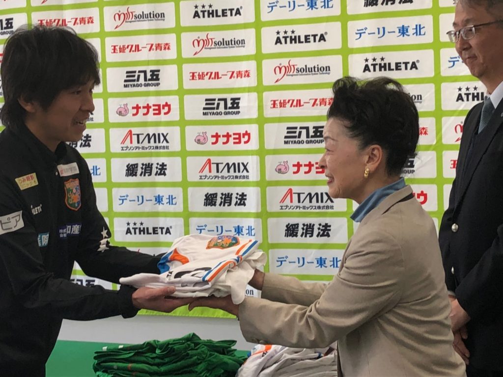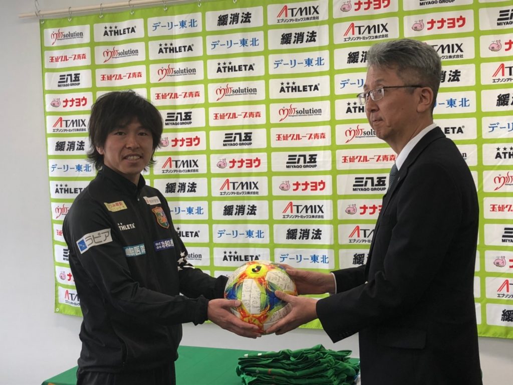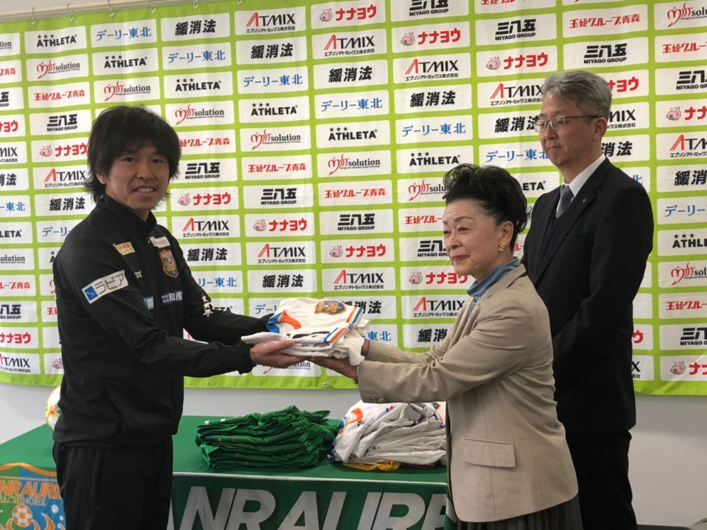 贈呈式にクラブを代表して出席した新井山祥智選手は「自分たちが大切に使ってきたユニフォームやボールを、この先、エチオピアの子供たちに使ってもらえる、このようなプロジェクトを企画してくださりありがとうございます。エチオピアの子供たちがこのユニフォームやボールに触れ、より一層サッカーを楽しく感じ、好きになってもらえたら嬉しいです。」と挨拶していました。