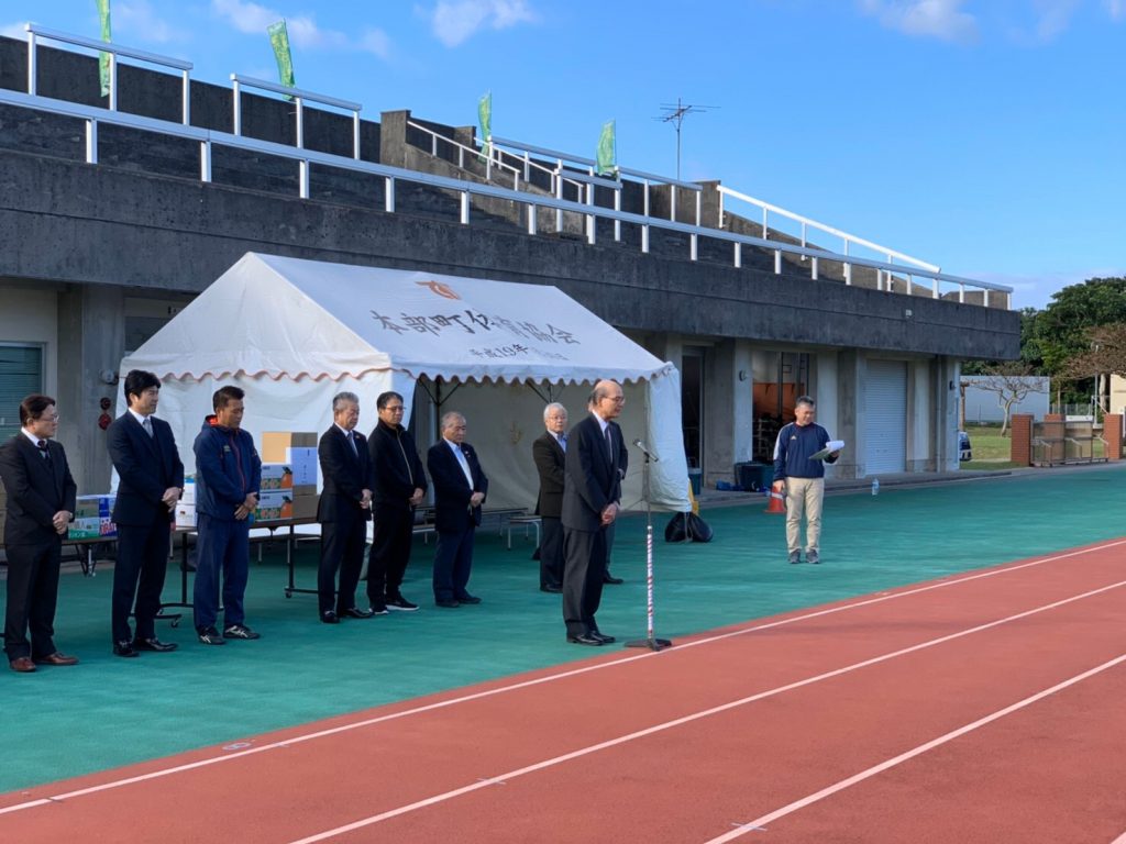 本部町教育委員長の中曽根清二様から歓迎のお言葉をいただき、オリオンビール株式会社 研究品質保証部長の島袋 勝様からのご挨拶、花束や特産品の贈呈などが行われました。