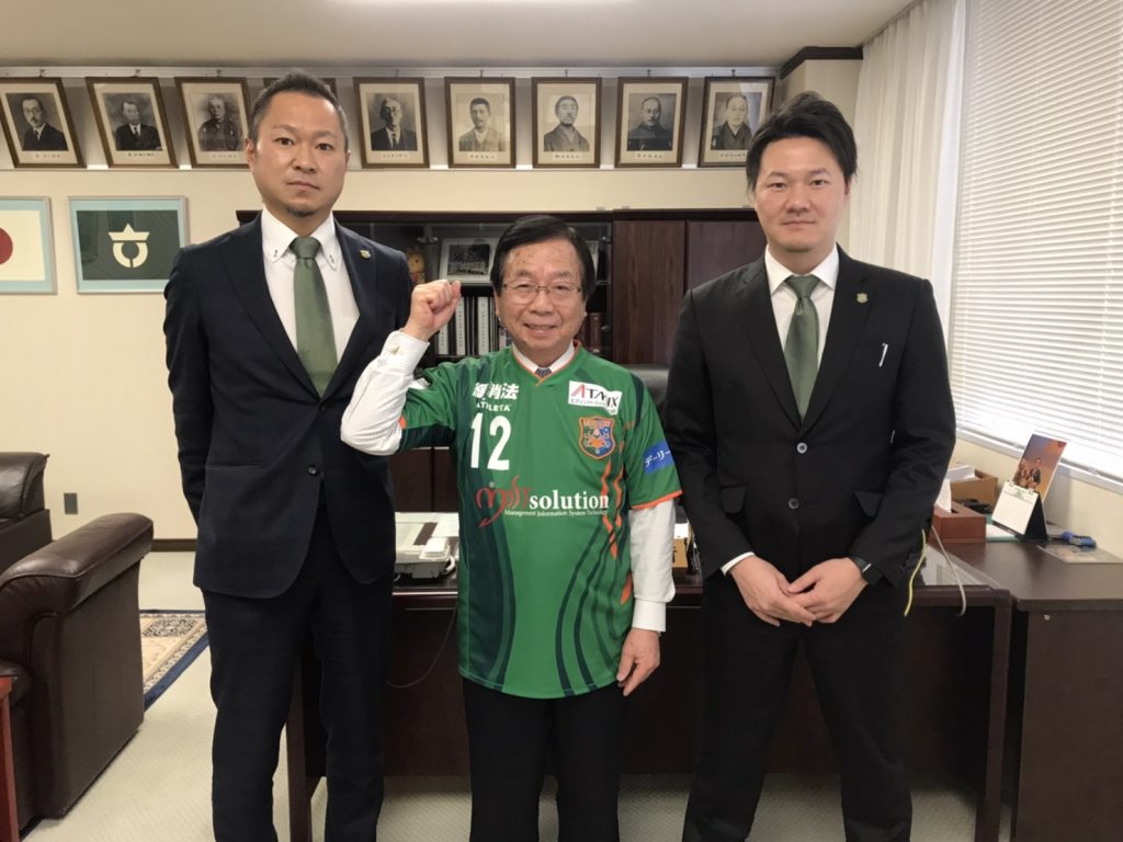 本日、 代表取締役 細越健太郎と取締役事業統括本部長の菅原康平が六ケ所村の戸田村長を表敬訪問し、2020シーズン開幕前のご挨拶とユニフォームの進呈を行いました。