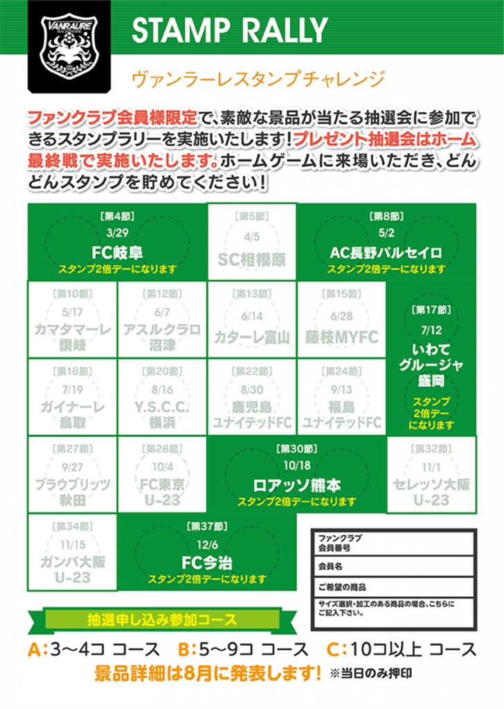 2020ヴァンラーレ八戸ファンクラブでは先行受付・一般受付の配送とアリーナ受取(月〜金10:00〜17:00 土日祝日休業)をスタートいたしました。今シーズンのファンクラブでは、今までよりもさらに充実したサービスを提供していきます。シーズン最終戦には豪華景品(2021レプリカユニフォーム・2021シーズンパスなど)が当たる大抽選会を実施!その参加権となるスタンプラリーチャレンジボーナスステージもご用意してありますのでぜひファンクラブへのご入会よろしくお願いします。