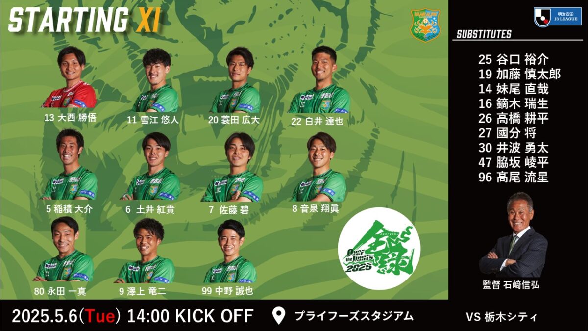 2025年5月6日(火・休)に行われました2025明治安田J3リーグ第12節 栃木シティ戦の結果をお知らせいたします。