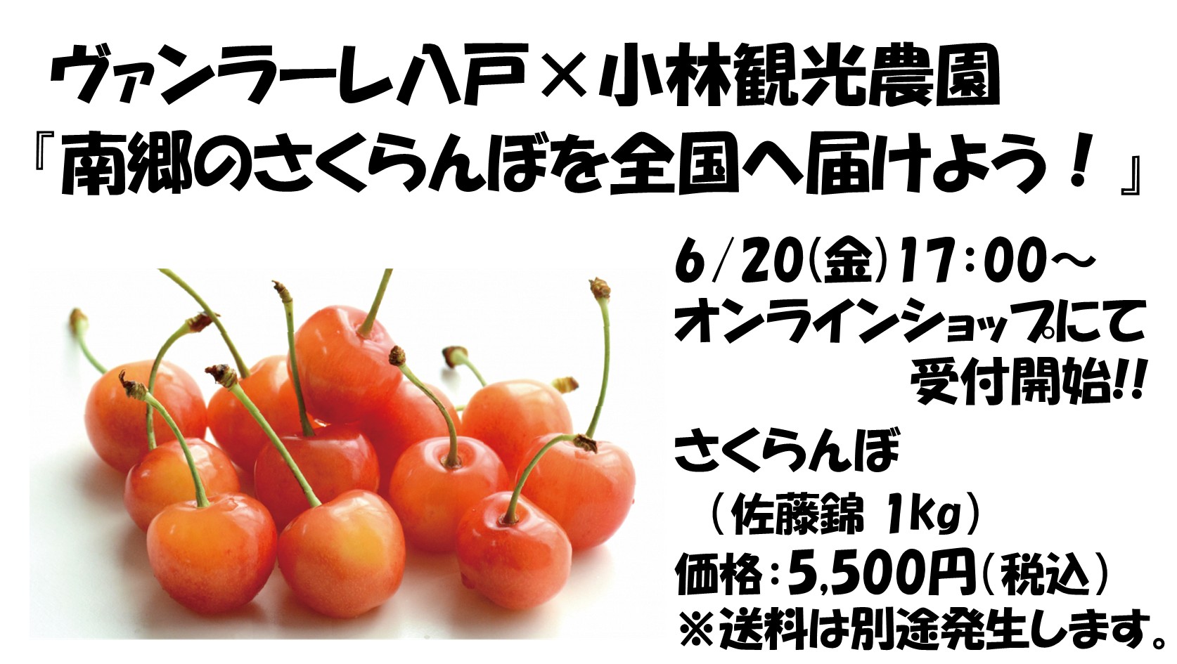 この度ヴァンラーレ八戸では、地域ブランド応援の一環として、八戸市南郷の小林観光農園様と協力し『全国へ新鮮な南郷のさくらんぼを全国へ届けたい』というコンセプトのもと、さくらんぼをオンラインショップにて販売します。
