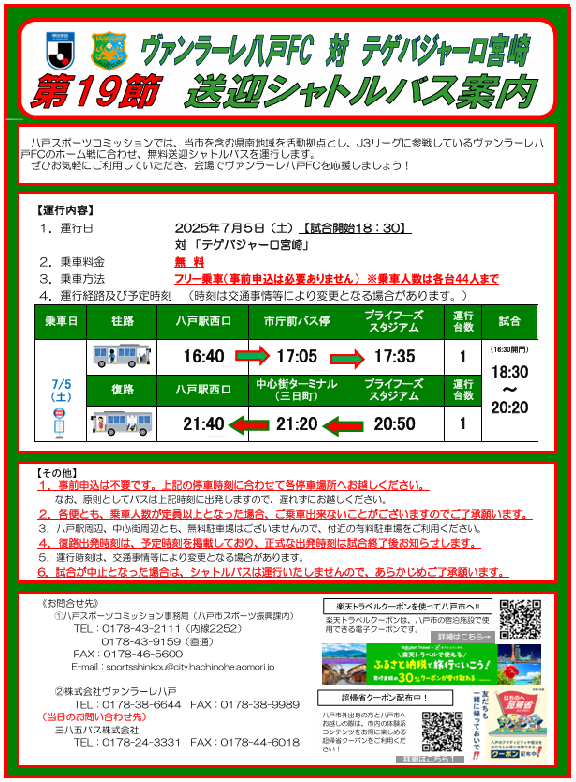 ・ご予約/ご利用の際は【ヴァンラーレ八戸応援タクシー定額サービスで】とお伝えください。
