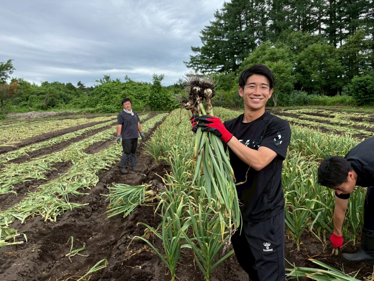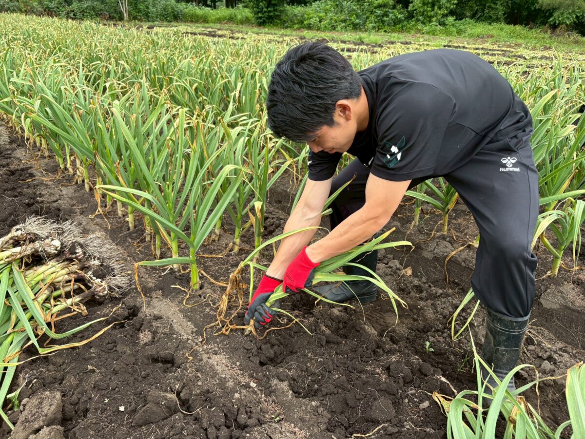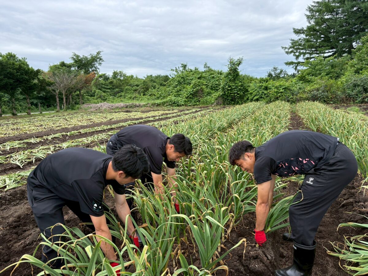 澤上竜二 選手・蓑田広大 選手・中野誠也 選手が八戸市南郷のにんにく畑を訪問し、収穫作業を行いました。