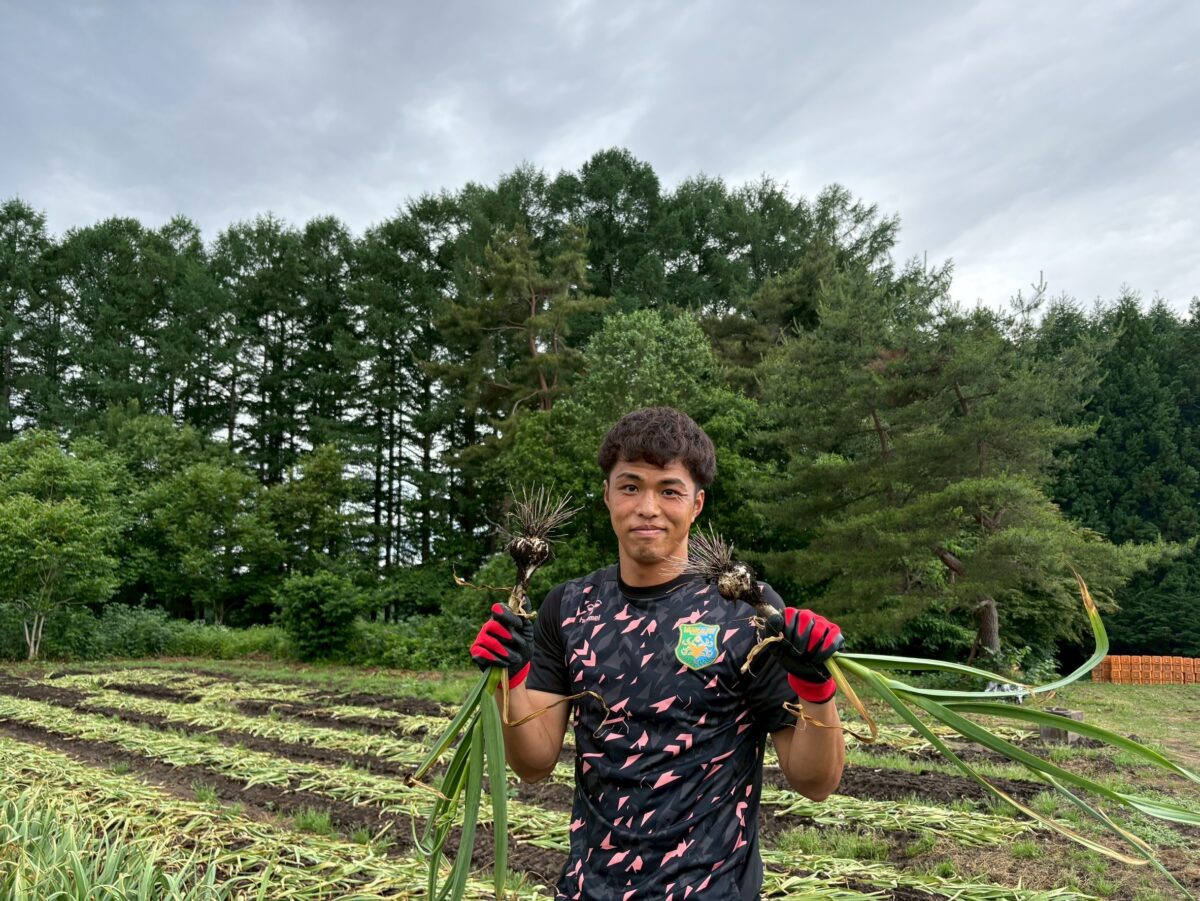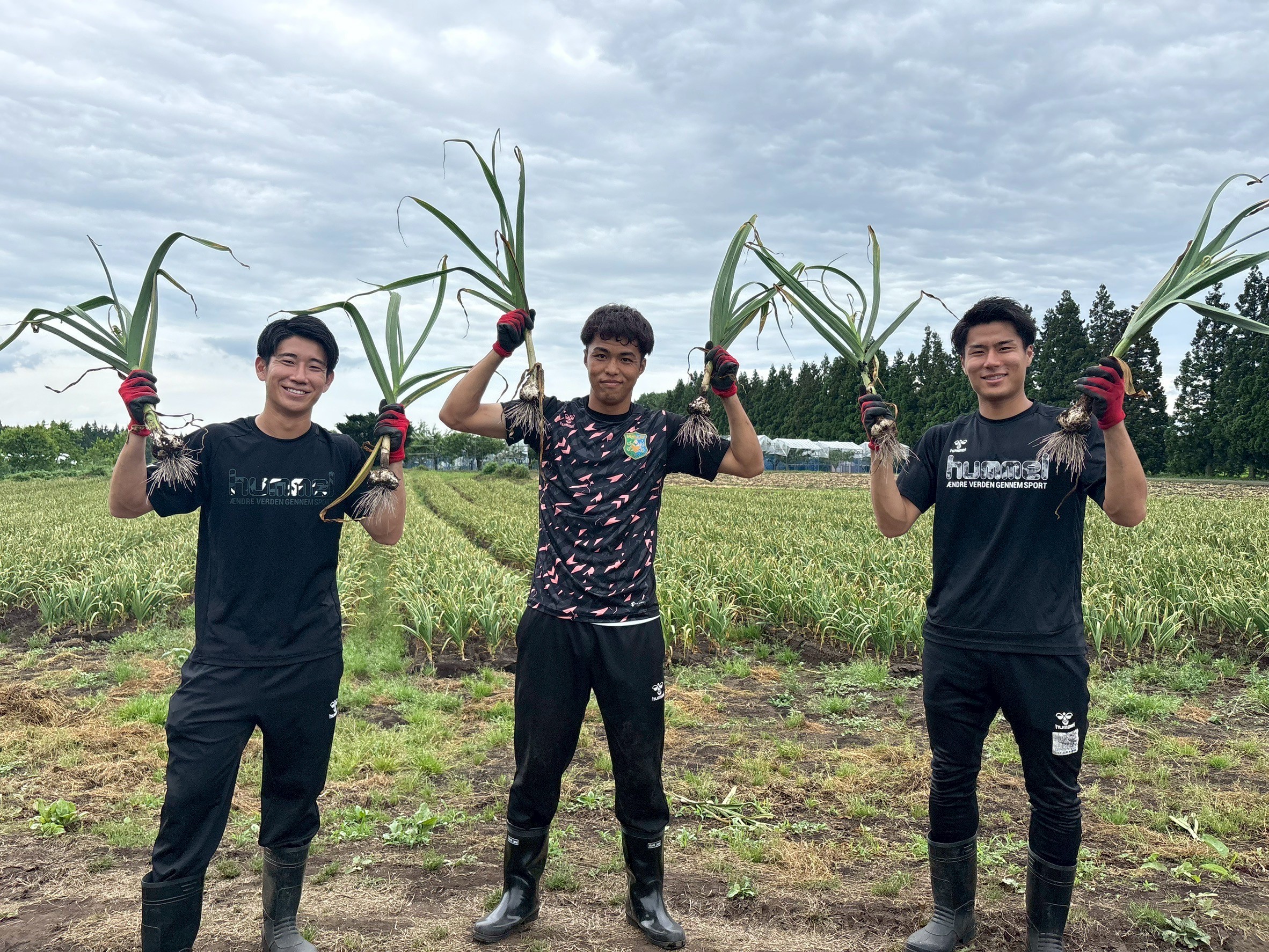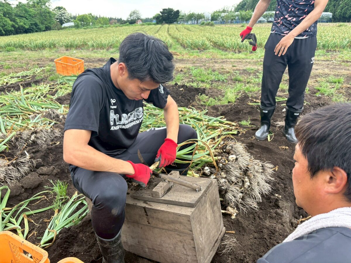 澤上竜二 選手・蓑田広大 選手・中野誠也 選手が八戸市南郷のにんにく畑を訪問し、収穫作業を行いました。