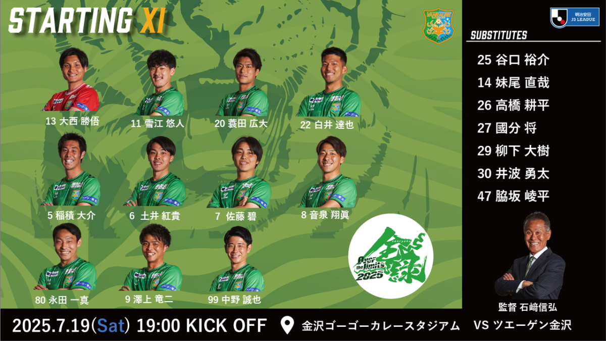 2025年7月19日(土)に行われました2025明治安田J3リーグ第21戦ツエーゲン金沢戦の試合結果をお知らせいたします。