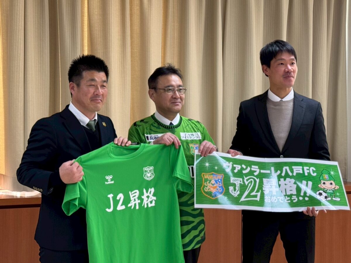 さらに、 J2昇格を記念して、八戸市庁舎に弾幕を設置していただき、熊谷市長、八戸市職員の皆さまと記念撮影をさせていただきました。