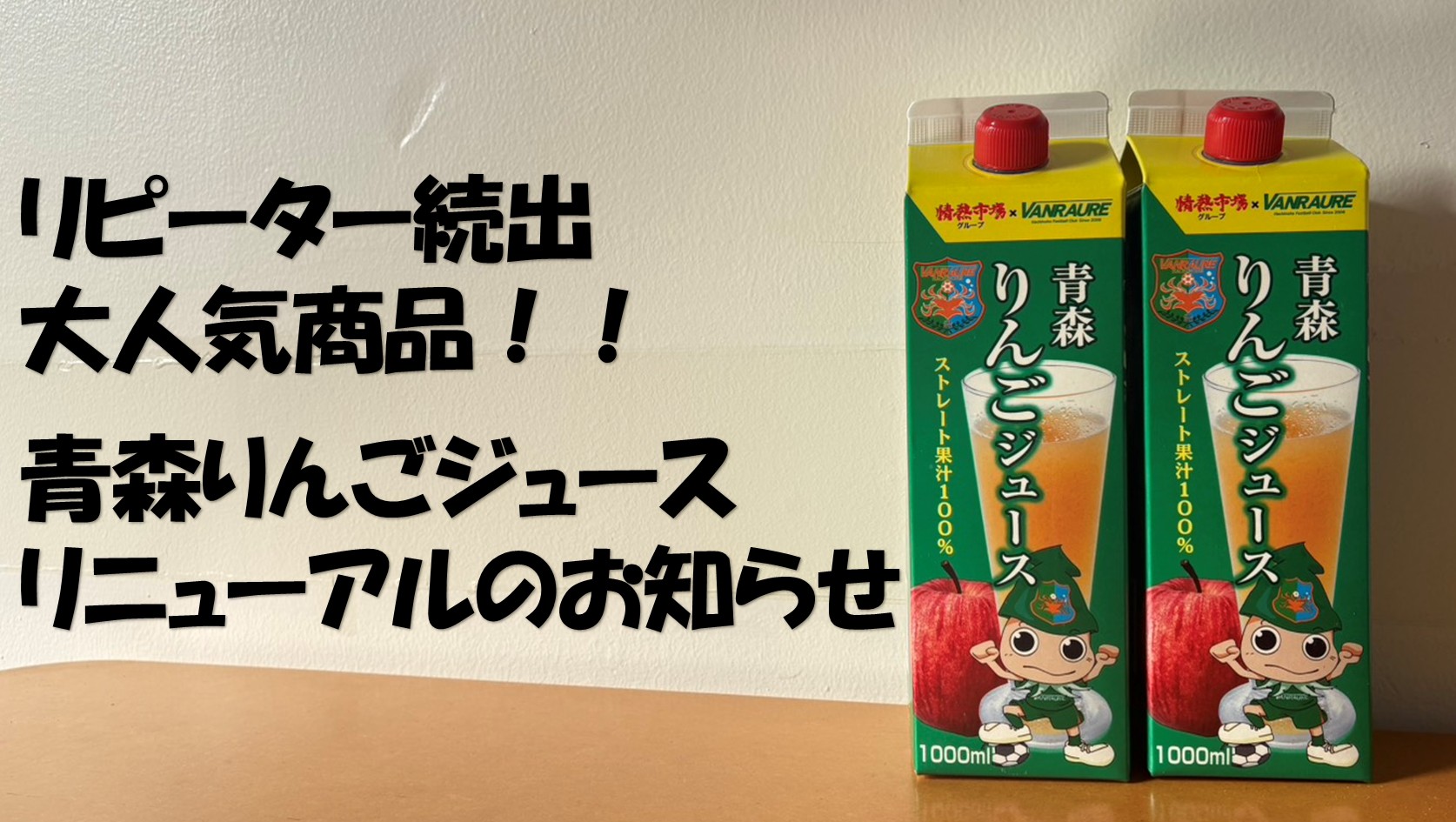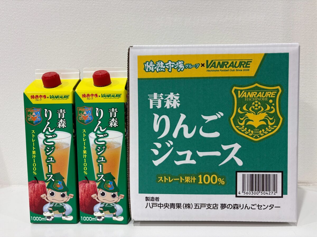 この度、八戸中央青果株式会社様とのコラボ商品「青森りんごジュース」の瓶タイプがリニューアルし、ヴァンラーレ八戸オリジナルデザインのパック仕様となりますのでお知らせします。