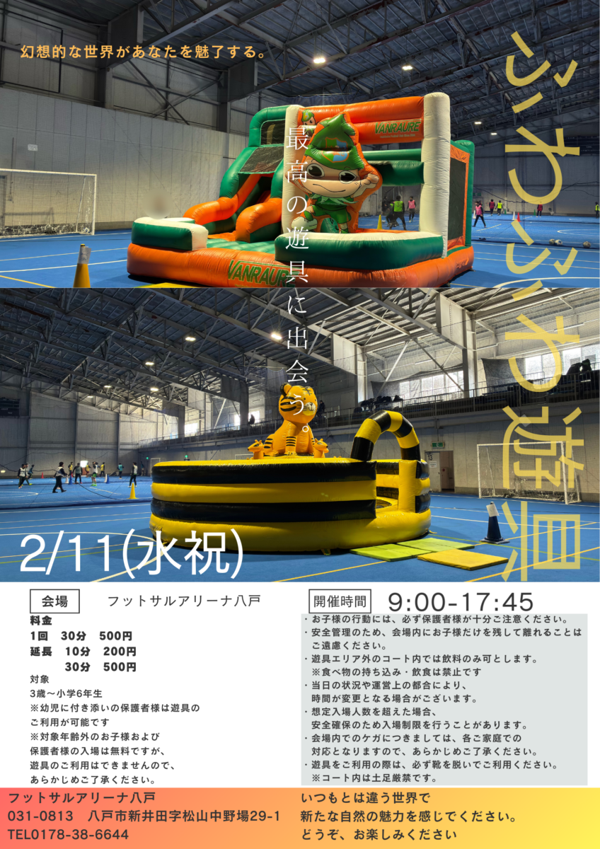 『ふわふわ遊具スペシャルinフットサルアリーナ八戸』を開催いたしますのでお知らせいたします。