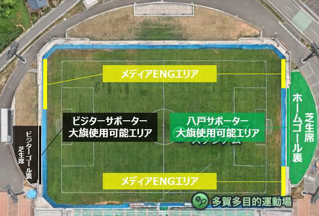 ○大旗はヴァンラーレ八戸サポーターは「芝生席ホームゴール裏」、ビジターサポーターは「芝生席ビジターゴール裏」席種内でのみ使用可能です。(それ以外のエリアでの使用は禁止です。)