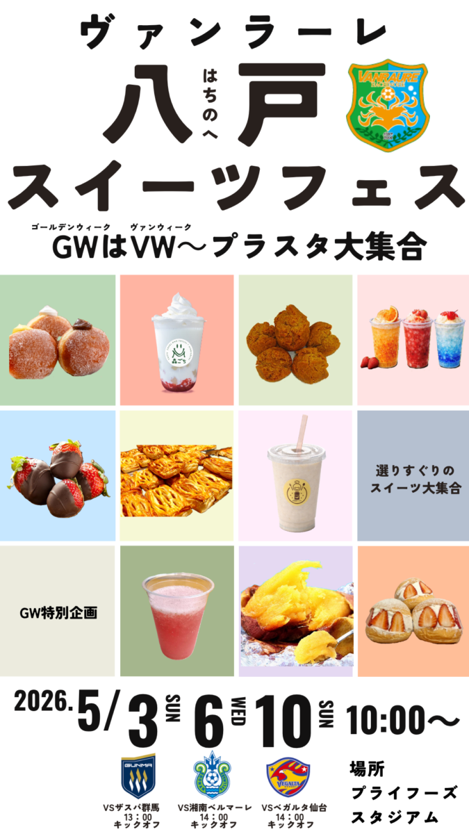 5月3日(日・祝)ザスパ群馬戦、5月6日(水・休)湘南ベルマーレ戦、5月10日(日)ベガルタ仙台戦で実施のヴァンラーレスイーツフェスと連動で購入商品の写真を「#GWはVW」をつけてXに投稿すると各試合で1名ずつに選手サイン入り試合球をプレゼント!