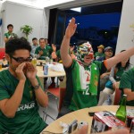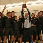 スタッフの知人が一晩で完成させたレプリカステージ杯を掲げました。