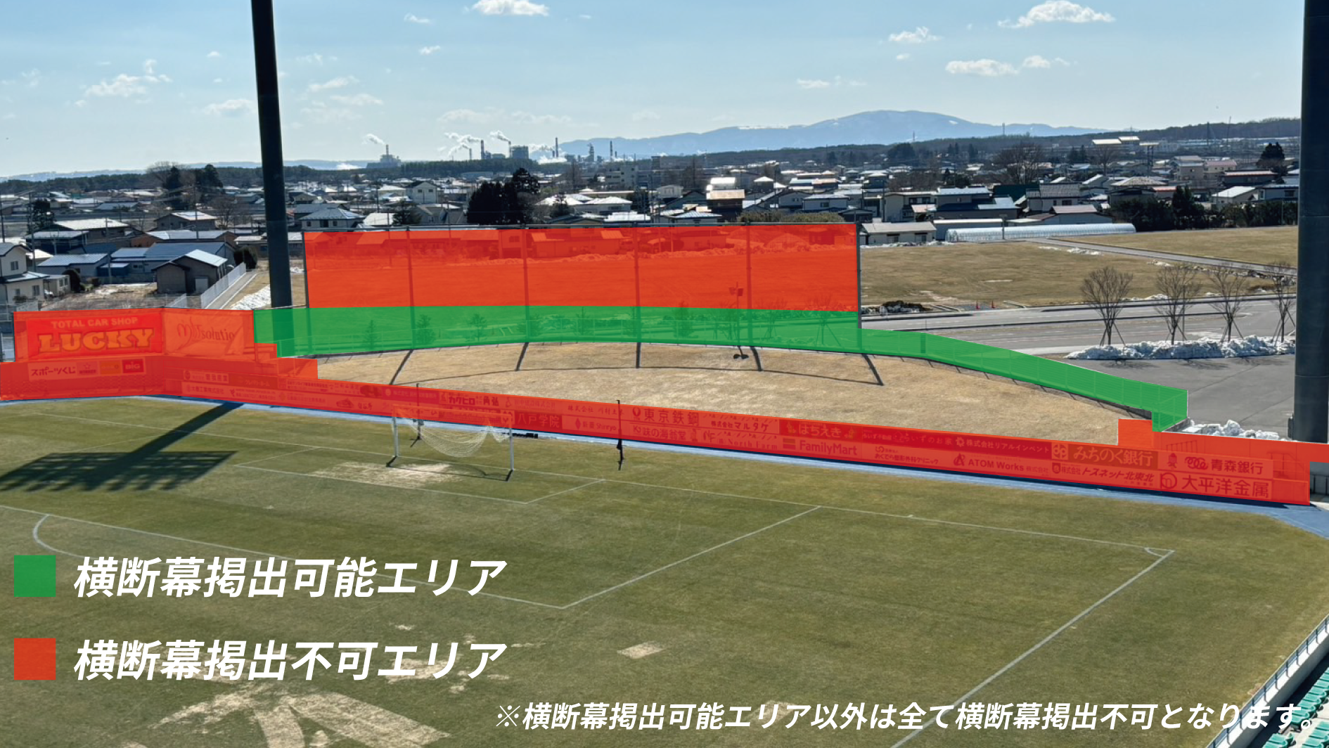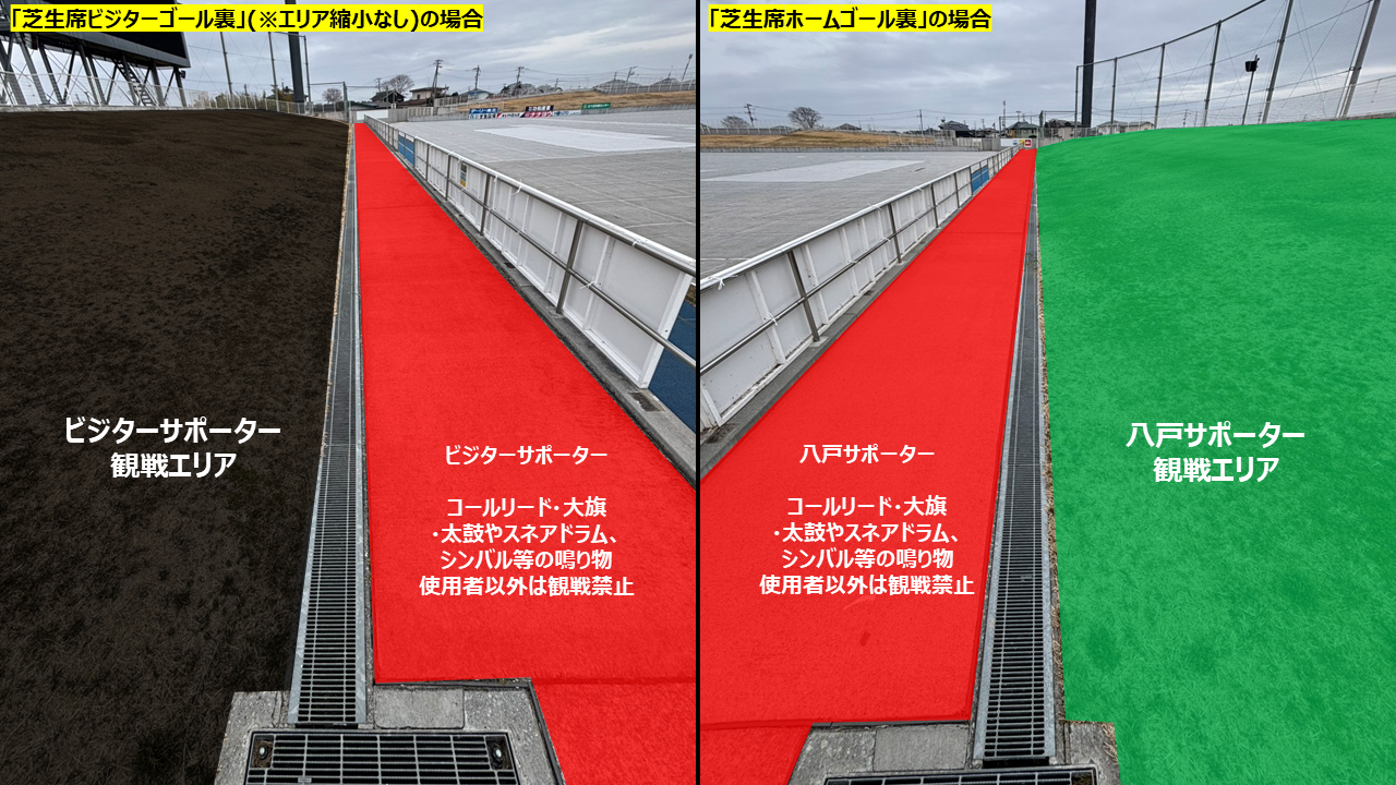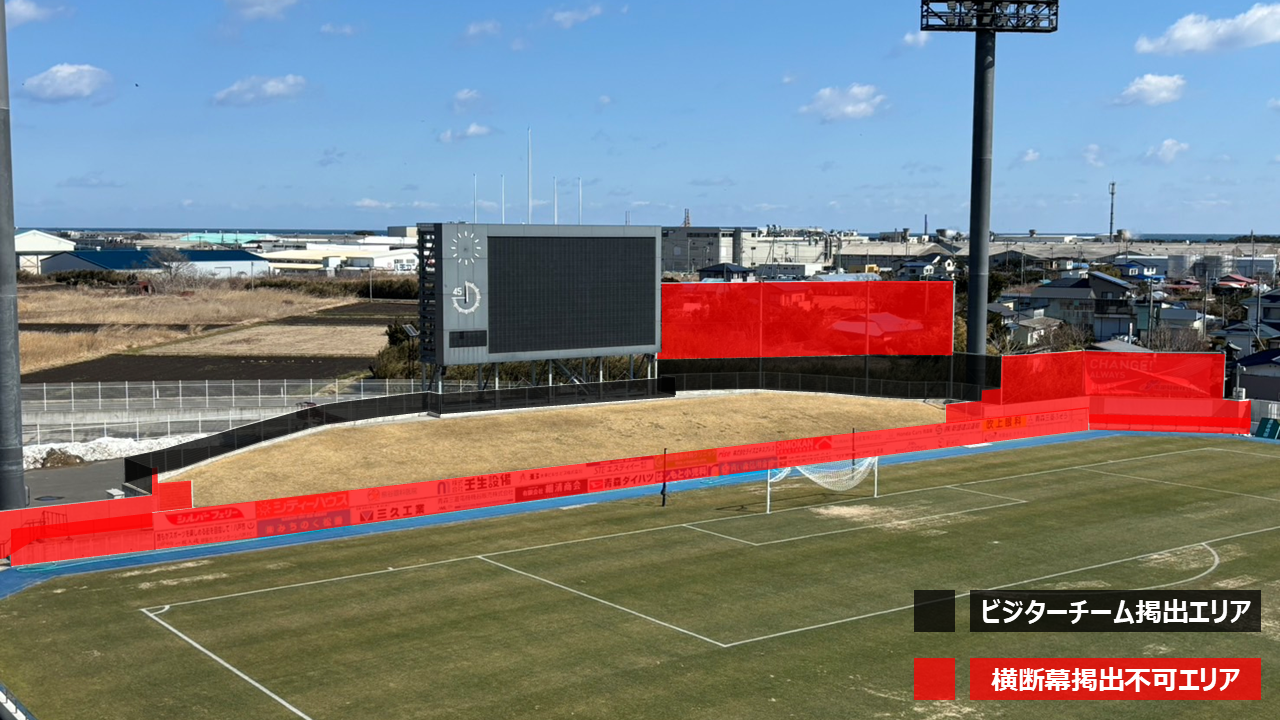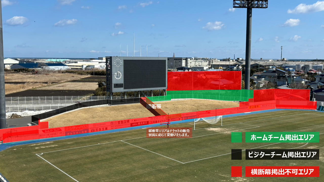 ※ビジター側ゴール裏の掲出エリアは「芝生席ビジターゴール裏」席種のエリア縮小の有無(緩衝帯設置の有無)により変動いたします。