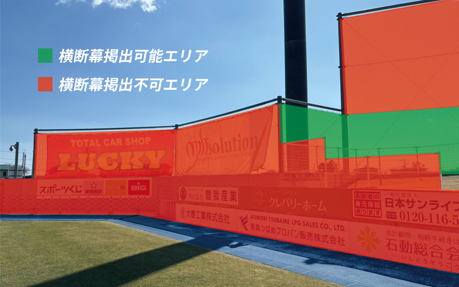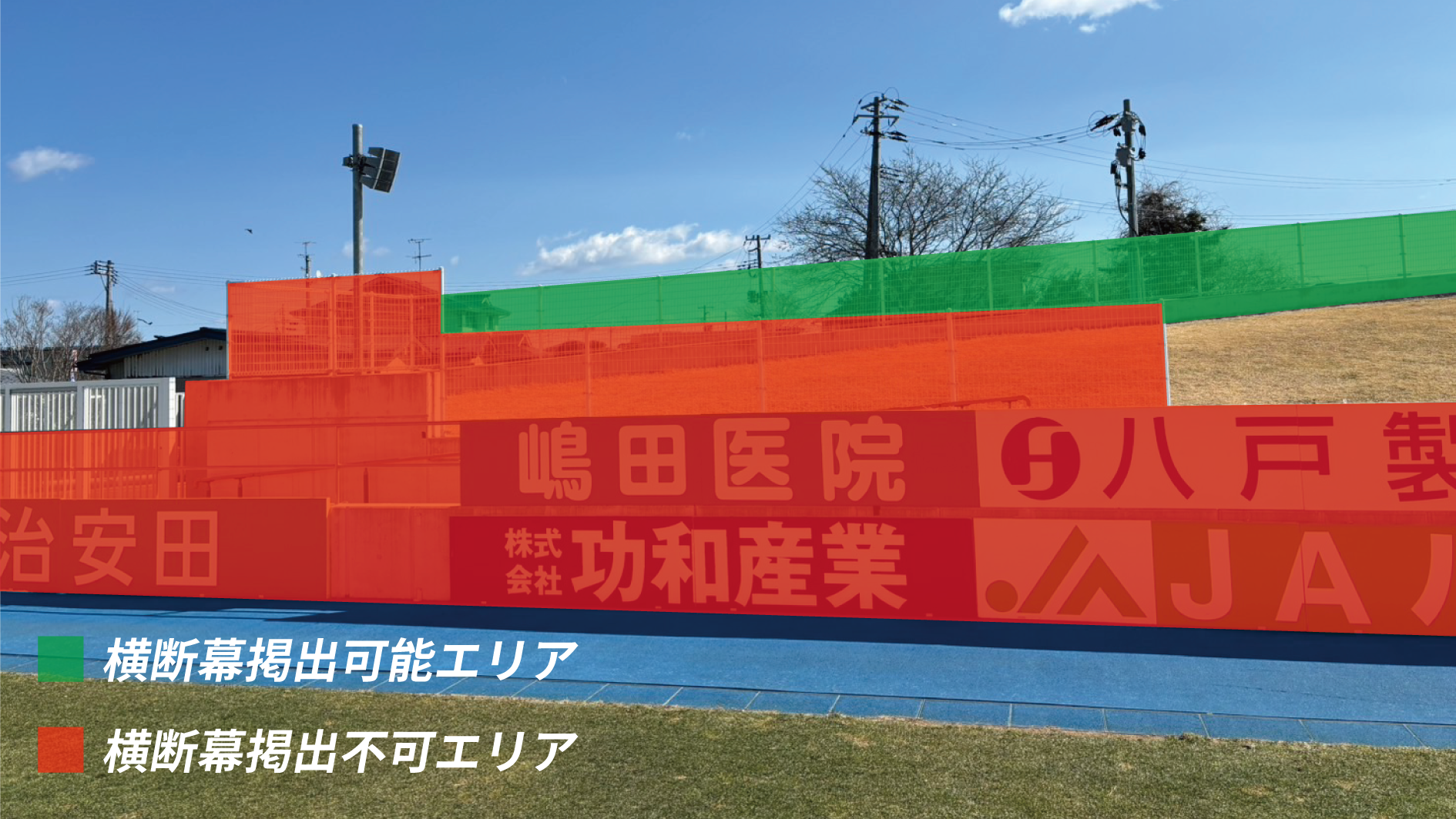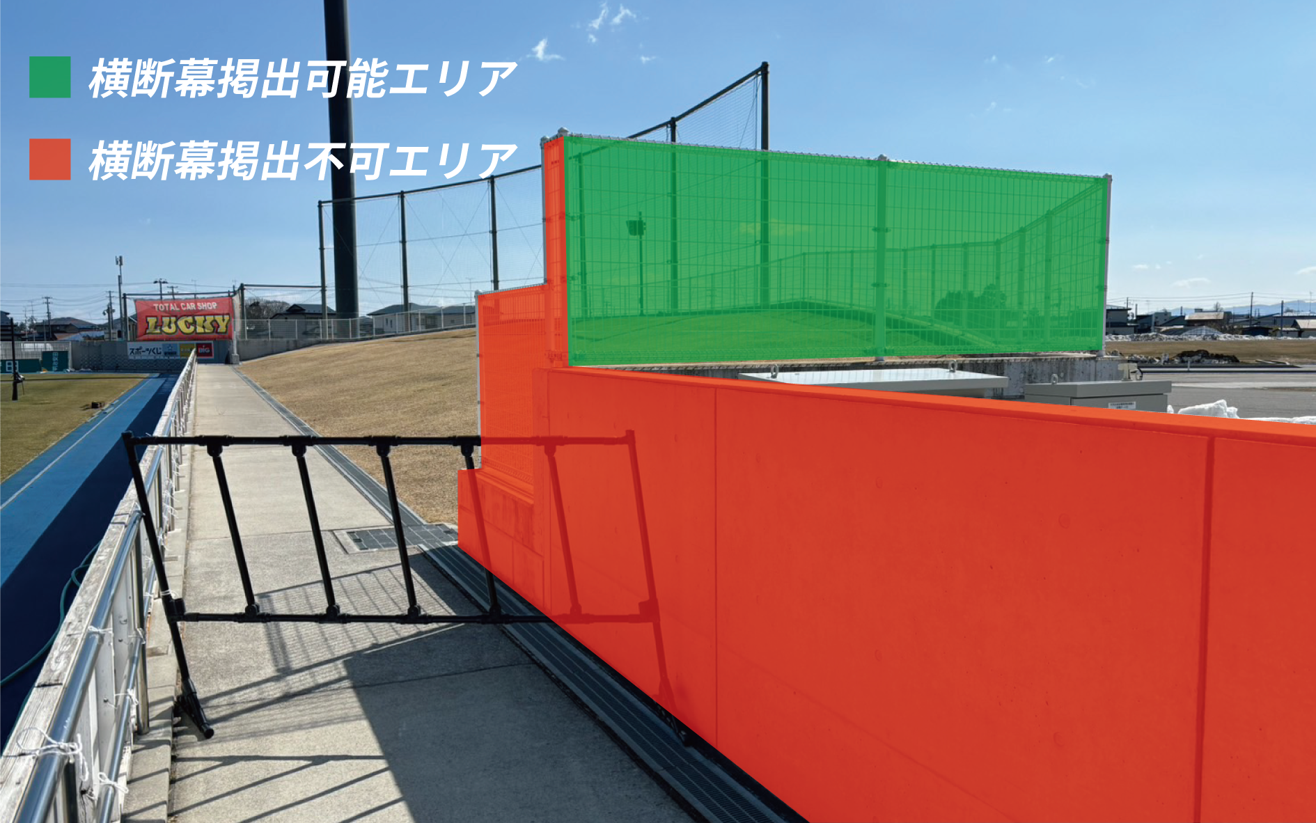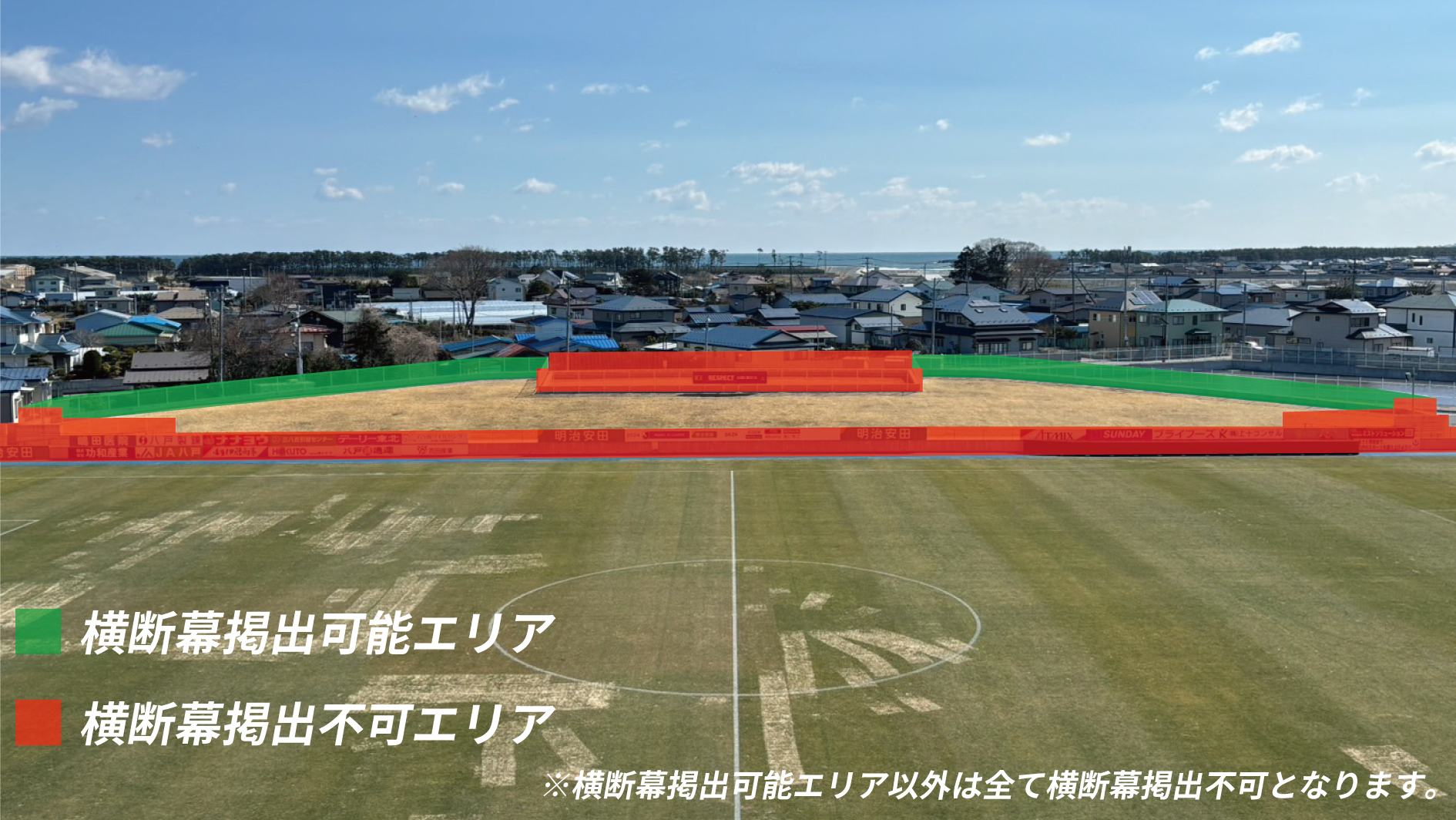※ビジター側ゴール裏の掲出エリアは「芝生席ビジターゴール裏」席種のエリア縮小の有無(緩衝帯設置の有無)により変動いたします。