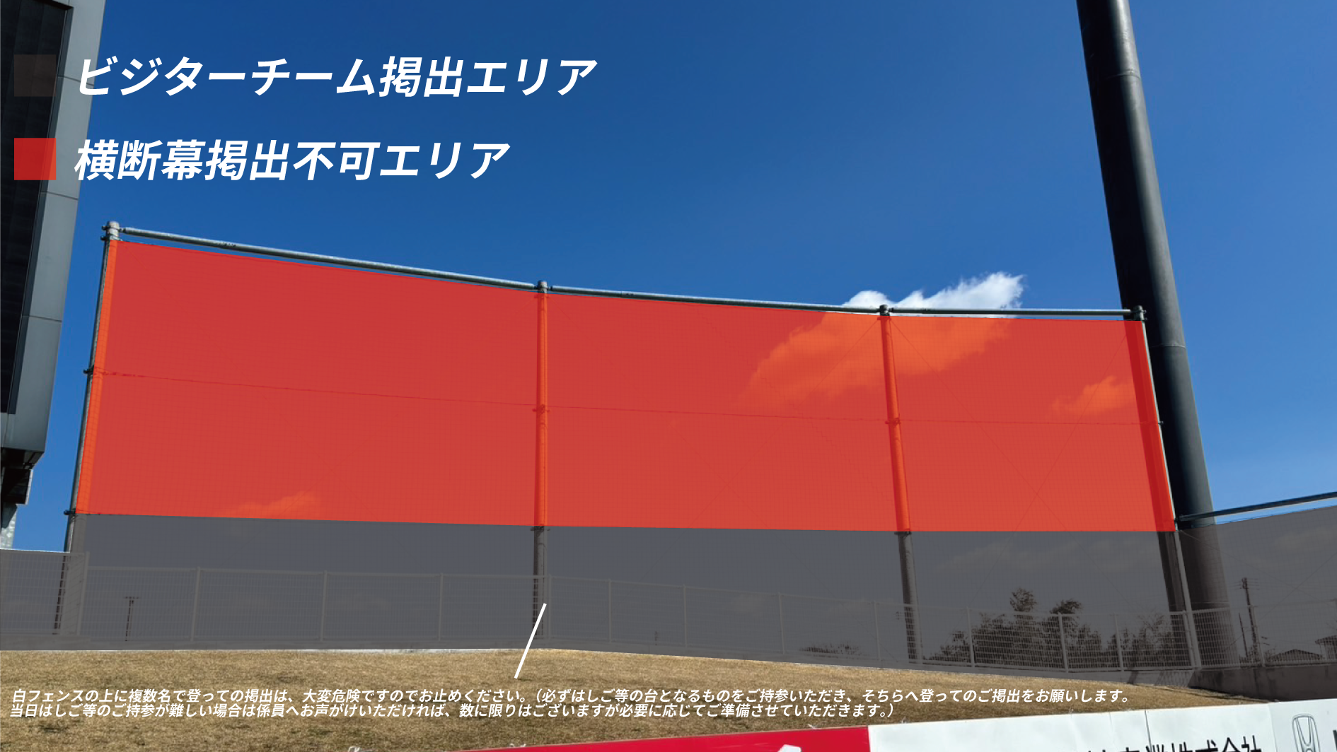 白フェンスの上に複数名で登っての掲出は、大変危険ですのでお止めください。
